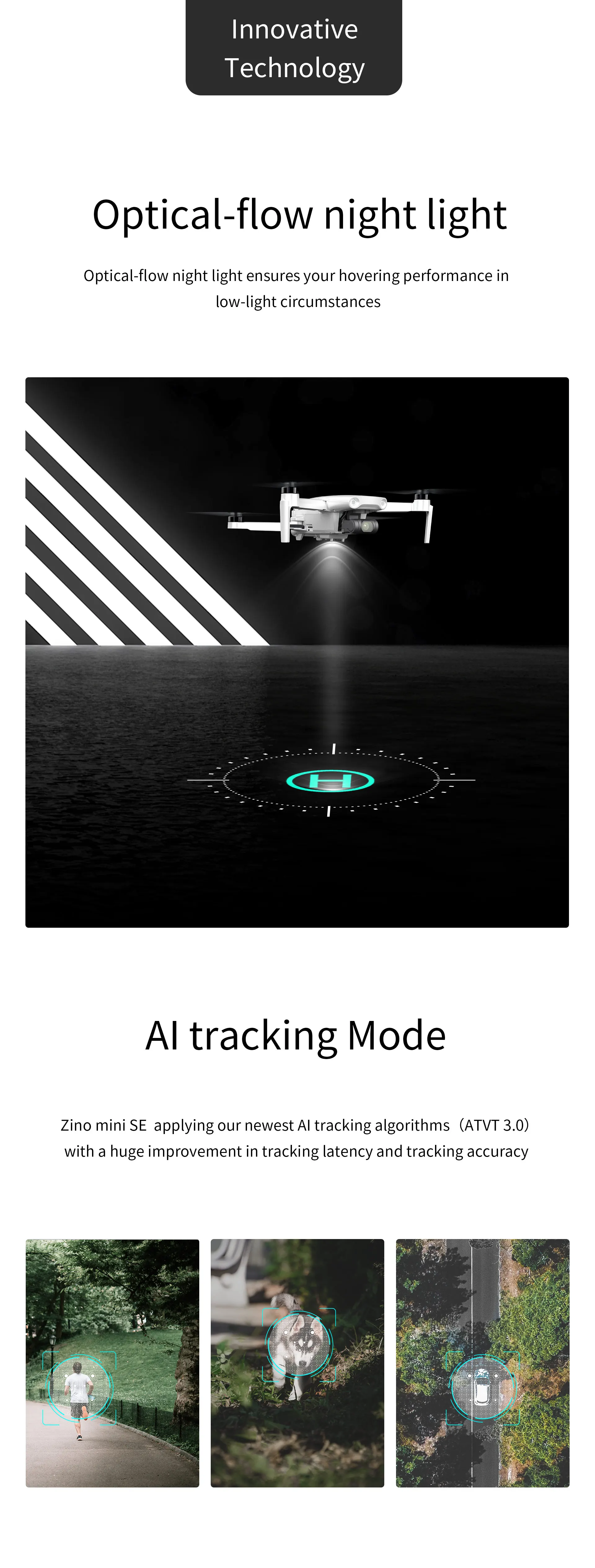 Ночной светильник с оптическим потокомОптико-потока ночной Светильник гарантирует, что ваши зависания производительность с низким уровнем светильник обстоятельстваРежим отслеживания AIZino mini SE использует наши новейшие алгоритмы отслеживания AI (ATVT 3,0) с огромным улучшением в отслеживании задержки и точности отслеживания