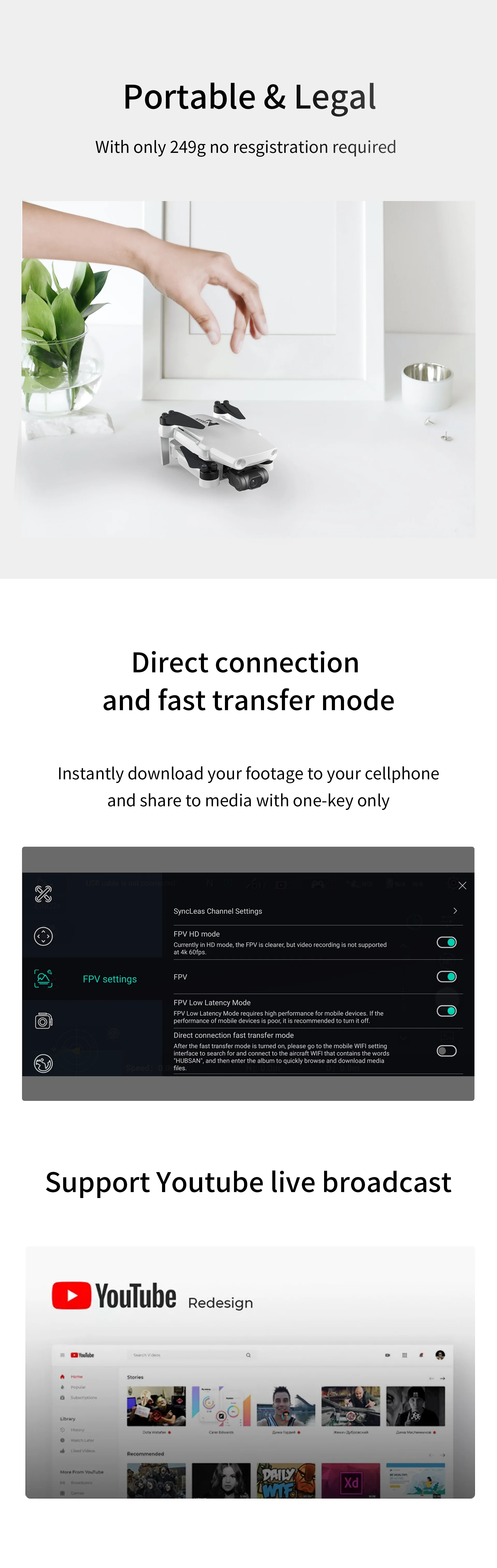 Портативный и юридическийТолько 249 г не требуется повторная обработкаПрямое подключение и быстрый режим передачиМгновенно загрузите ваши кадры на свой мобильный телефон и поделитесь ими только с помощью одной кнопки