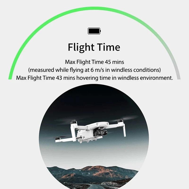 Точность и безопасностьBuit-in интеллектуальный блок управления батареей с точностью емкости, статистическими и ВКЛ-ВЫКЛ алгоритмами управления гарантирует безопасность вашего полета.Время полетаМаксимальное время полета 45 минут (измеряется при полете в 6 м/с в непродуваемых условиях)Максимальное время полета 43 минут время зависания в безветренной среде