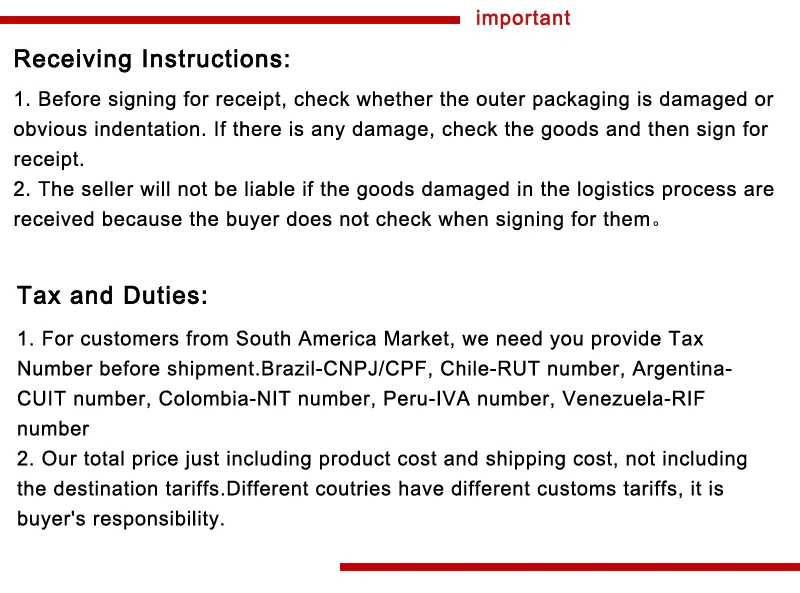 4. О тарифах: В разных странах существуют различные исходные точки для тарифов. Если купленные товары имеют тарифы, покупатели должны сотрудничать с таможней, чтобы решить их.