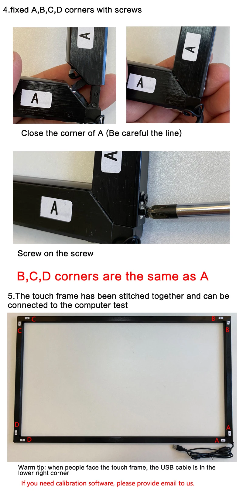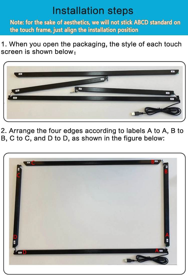 5. Мы прикрепили двустороннюю ленту к задней части ИК-сенсорной рамы, И вам нужно поместить четыре свободные рамки вместе и проверить их, прежде чем вы сможете установить сенсорную рамку IR перед дисплеем. Если требуется программное обеспечение для тестирования и калибровки, пожалуйста, сообщите нам адрес электронной почты