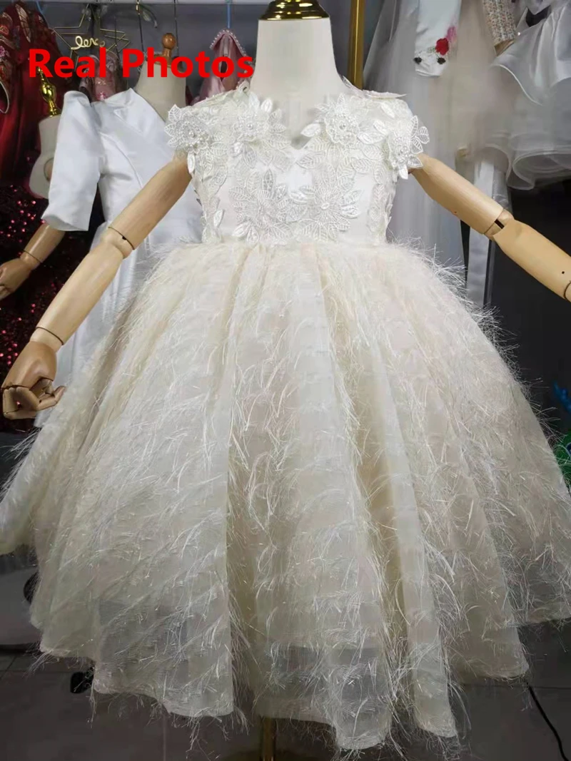 Белое платье с перьями для маленьких девочек, пышное элегантное детское платье, размер 12 м, костюм принцессы, платье для вечеринки, свадьбы