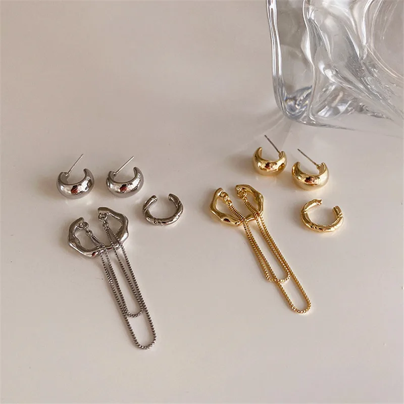 Новый дизайн, золотые, серебристые металлические геометрические серьги-клипсы с неровной кисточкой и цепочкой для женщин, не прокалываемые серьги-манжеты, 2021 ювелирные изделия