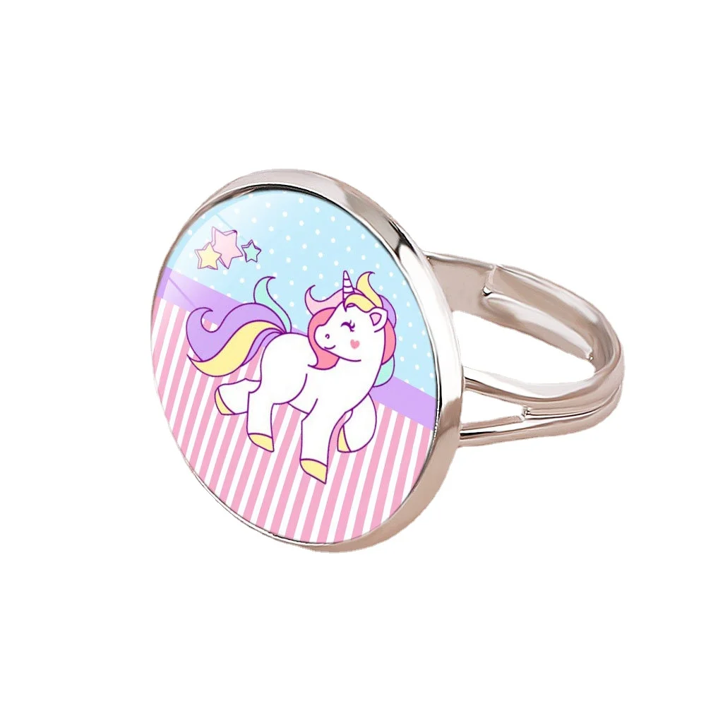 [Материал]: нержавеющая сталь [Вес нетто]: около 5 г/шт. [Диаметр кристалла]: около 18 мм [Наименование товара]: новые аксессуары для детей; Подарок на день детей; Красивое кольцо с изображением единорога
