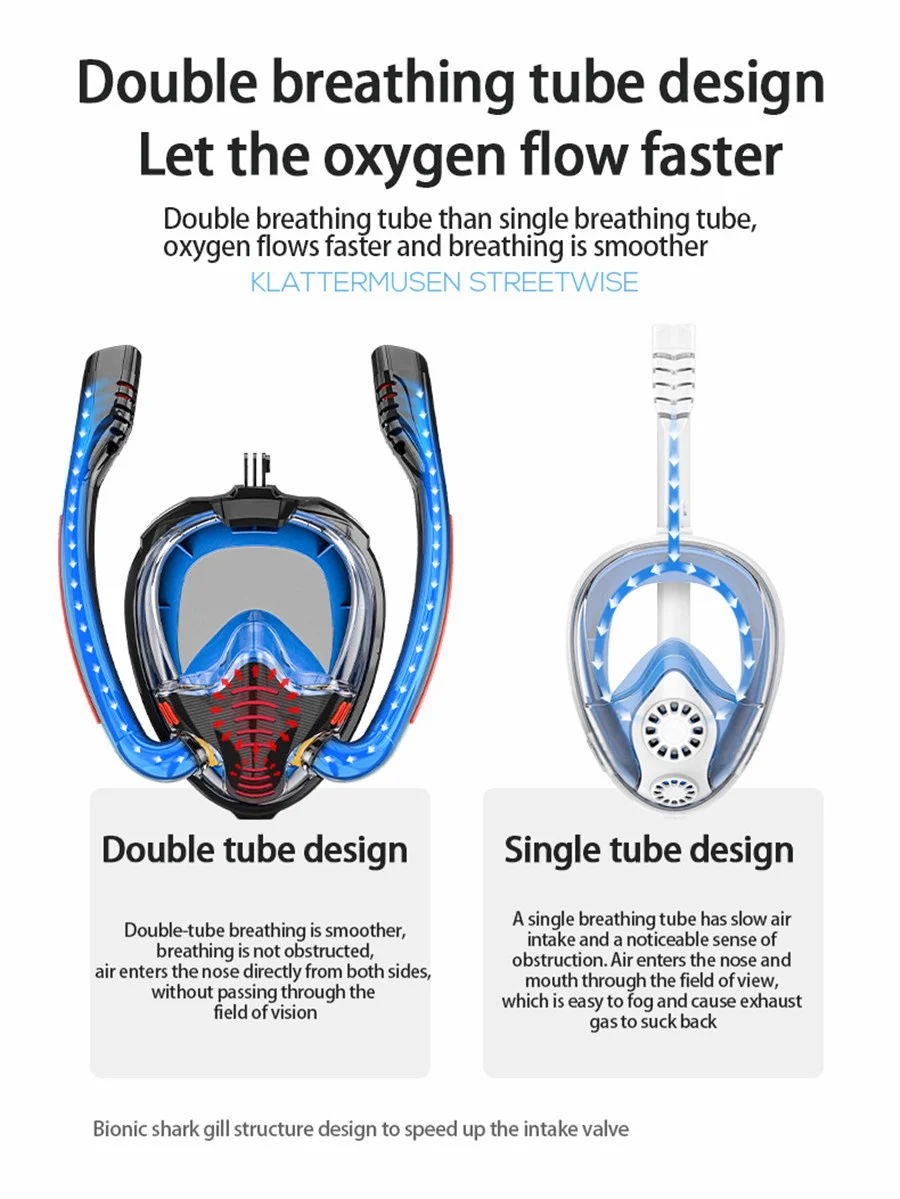 1. Ингаляция поступает через двойную дыхательную трубку. Отдельная дыхательная камера эффективно предотвращает накопление углекислого газа и гарантирует, что свежий воздух всегда циркулирует через маску для дайвинга.