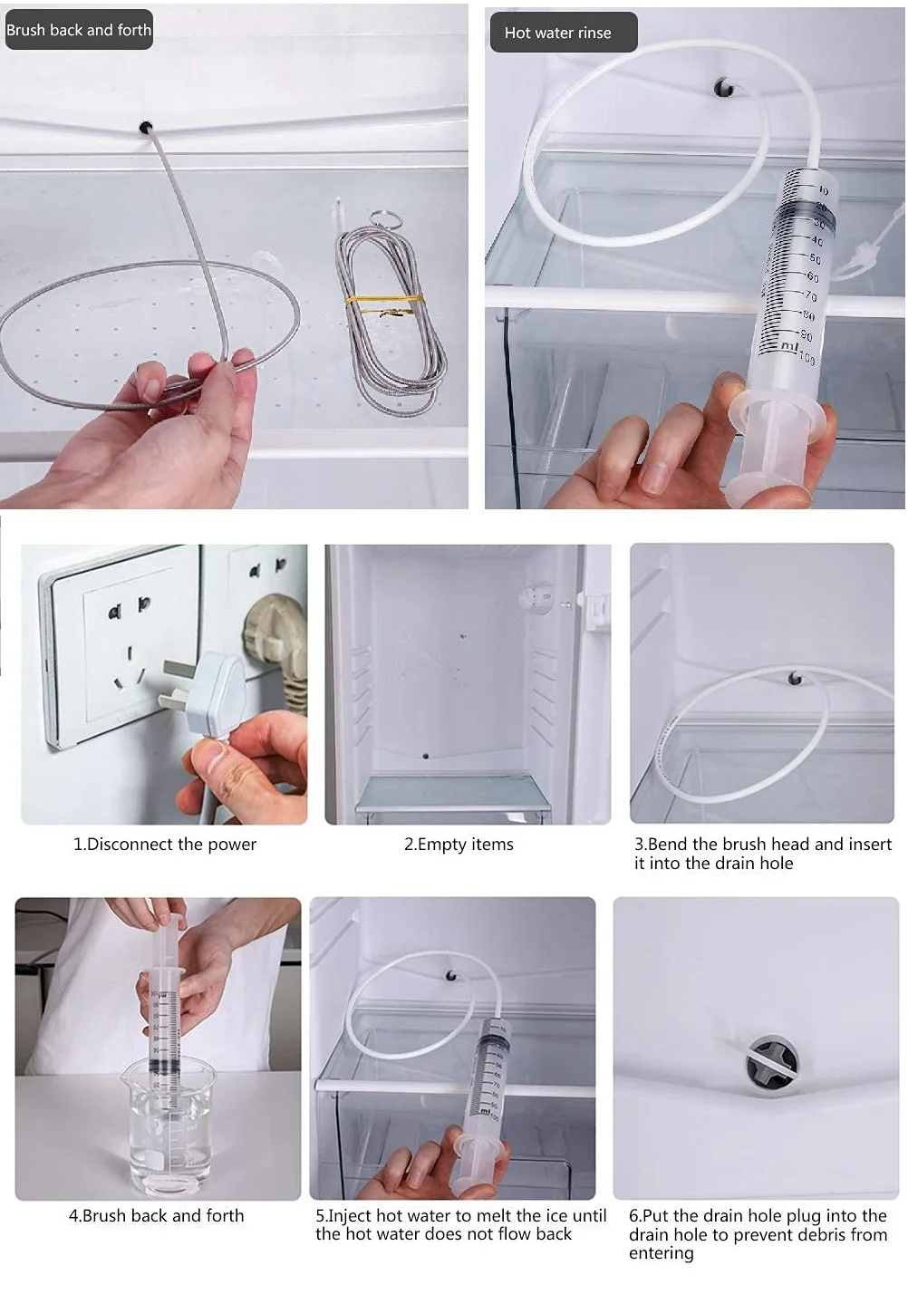 Характеристика:1. Помогает удалить засорение сливного отверстия холодильника, решить проблему утечки и устранить специфический запах, вызванный блокировкой.2. Подходит для всех брендов холодильников, морозильников и винных шкафов.3. Нет необходимости выключать оборудование во время использования, чтобы избежать ухудшения качества пищи.4. Трубка большой емкости, которая может быть повторно использована.5. Передний угол режущего дизайна позволяет легко вставляться в дренажную трубу для дноуглубления и обеспечивает лучшие результаты.