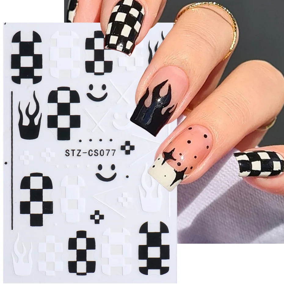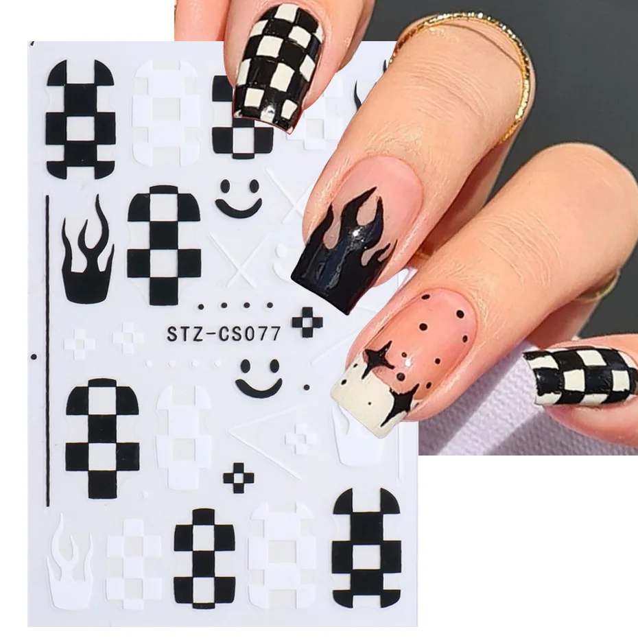 [Тип продукта] 3D стикер для ногтей[Стиль] черно-белые Пламенные шахматные наклейки для ногтей, 3D наклейки, Геометрические полосы, французские кончики, Слайдеры для дизайна ногтей, украшения из фольги[Цвет] белый, черный, зеленый, синий, золотой, розовый, фиолетовый[Упаковка] 1 лист[Размер] 9,6*6,3 см[Применение] рекомендуется использовать на гелиевом покрытии и закрепить гелем