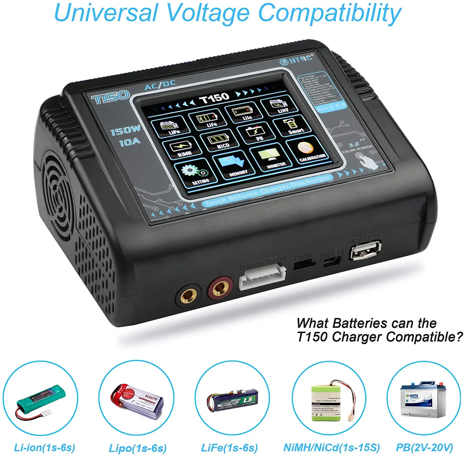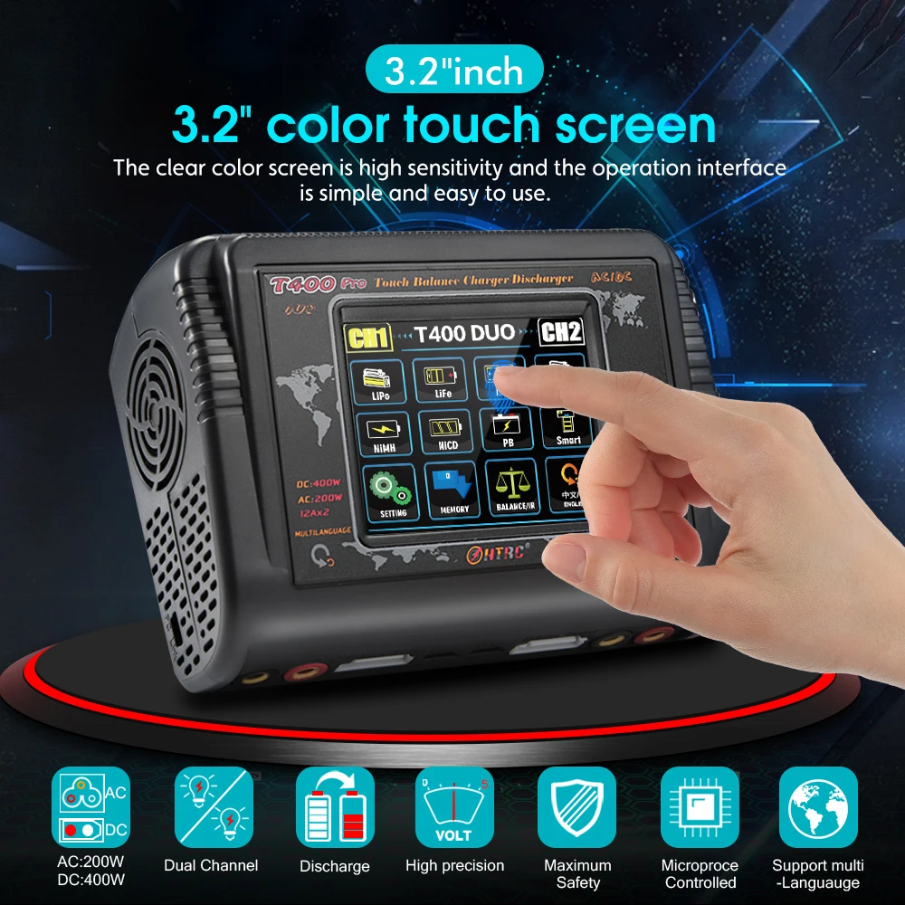 T400-это новое зарядное устройство HTRC с двойным балансом, которое может заряжать два разных типа батарей одновременно. Многофункциональный, высокая мощность, использование 3,2 дюйма цвет ЖК-дисплей Toch экран дисплея, легкая работа, встроенный вентилятор охлаждения, DC 11-18V или AC 100-240 В двойная мощность. Предназначен для зарядки аккумуляторов LiPo LiFe Lilon LiHV NiCd NiMh Pb Smart.