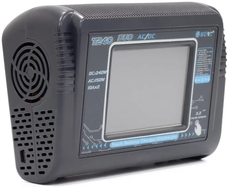 T240-это новое дизайнерское двойное зарядное устройство HTRC, которое может заряжать два разных типа батарей одновременно. Многофункциональный, высокая мощность, использование 3,2 дюйма цвет ЖК-дисплей Toch экран дисплея, легкая работа, встроенный вентилятор охлаждения, DC 11-18V или AC 100-240 В двойная мощность. Предназначен для зарядки аккумуляторов LiPo LiFe Lilon LiHV NiCd NiMh Pb Smart.