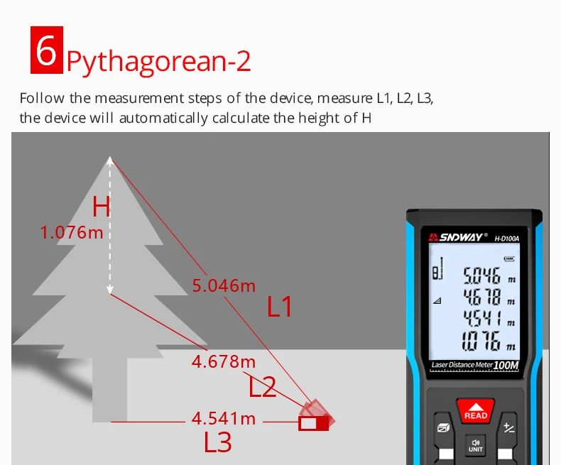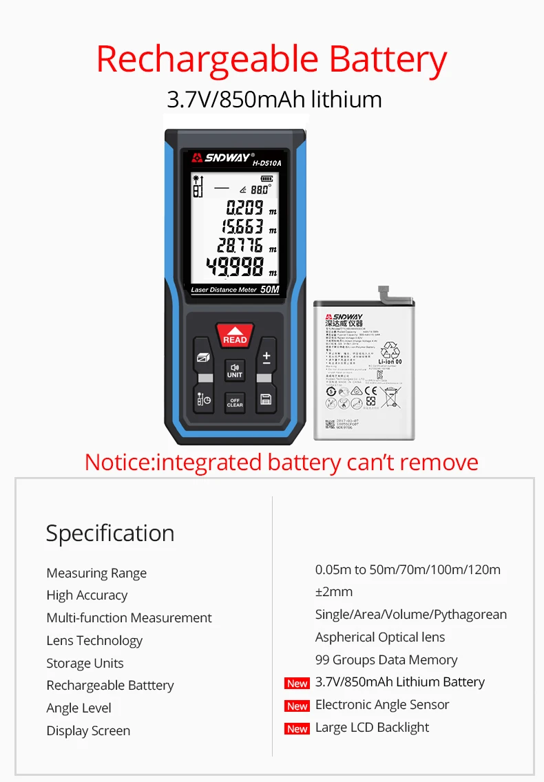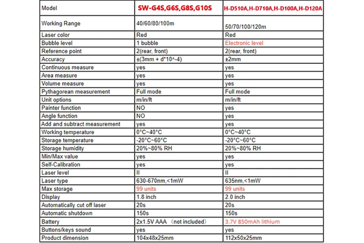 Только лазерный дальномер серии H-D с перезаряжаемой интегрированной литий-ионной батареейРазличные функции измерения: расстояние, площадь, объем, Пифагора, угол, функция художника.Обеспечивает быстрое и эффективное измерение и стоит своих денег.Лазерный дальномер серии H-D с электронным датчиком угла для справки при горизонтальных измерениях
