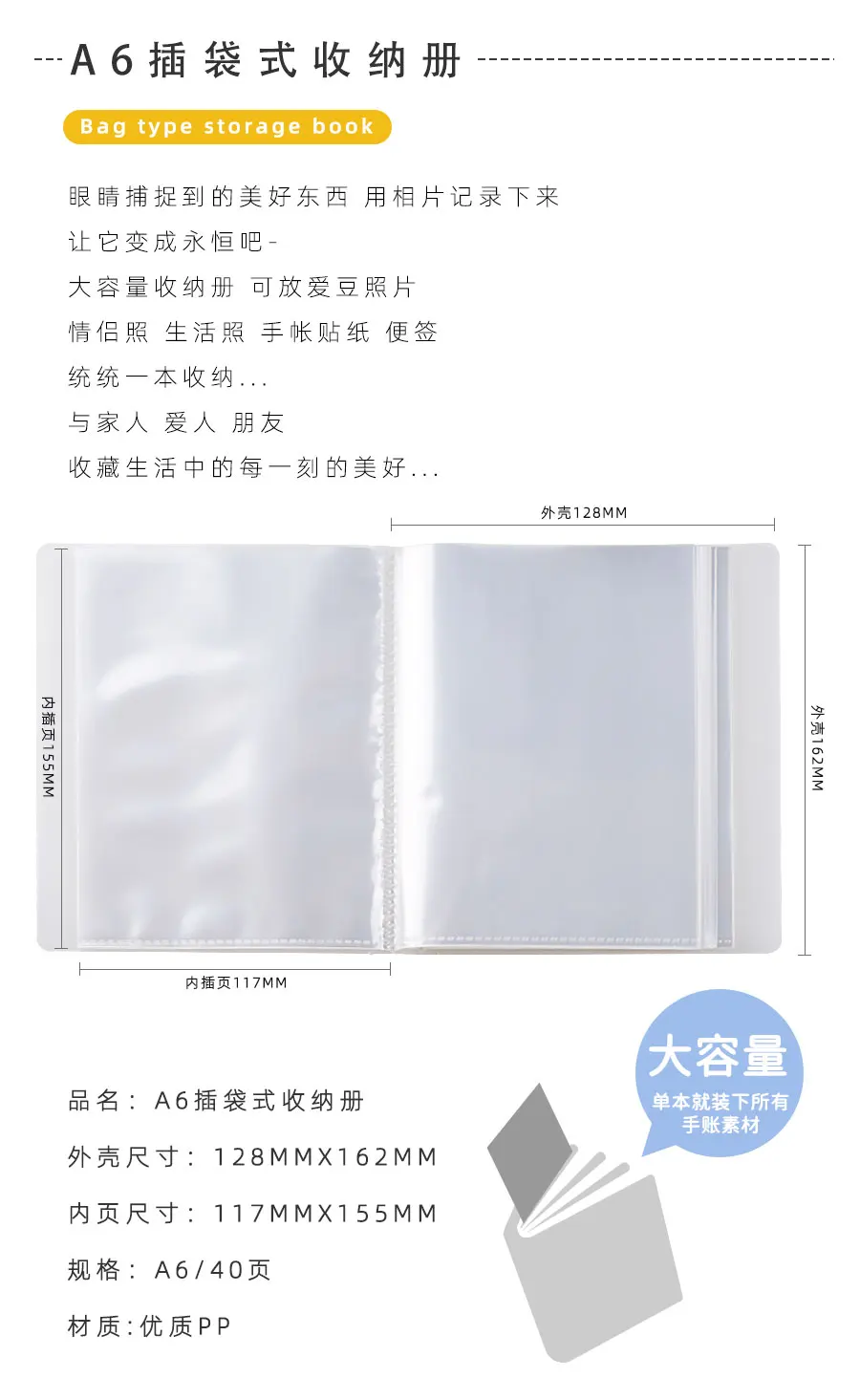 Прозрачный альбом Yoofun A6, альбом для фотографий, наклеек, листов из материала для карточек, книга для хранения, прозрачный карманный альбом, 40 листов