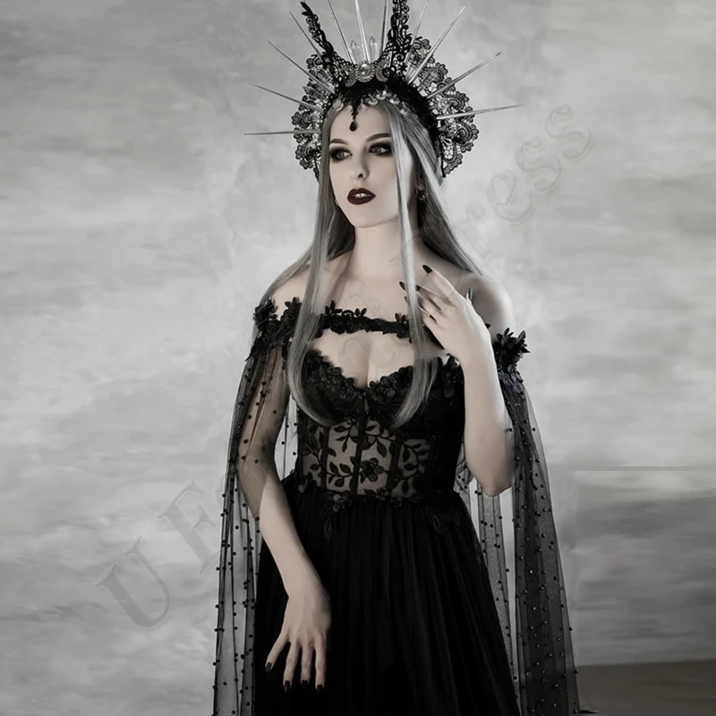 Потрясающее черное свадебное платье на бретелях с V-образным вырезом