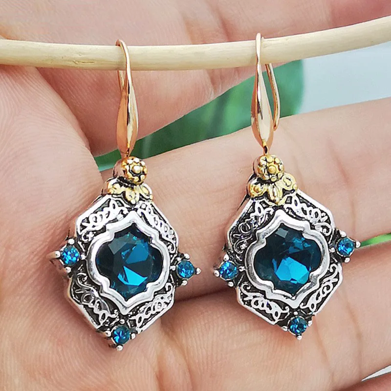 Серьги-подвески в этническом дворцовом стиле женские, классические висячие украшения в виде ромба с инкрустированными синими кристаллами, с гравировкой и геометрическим рисунком