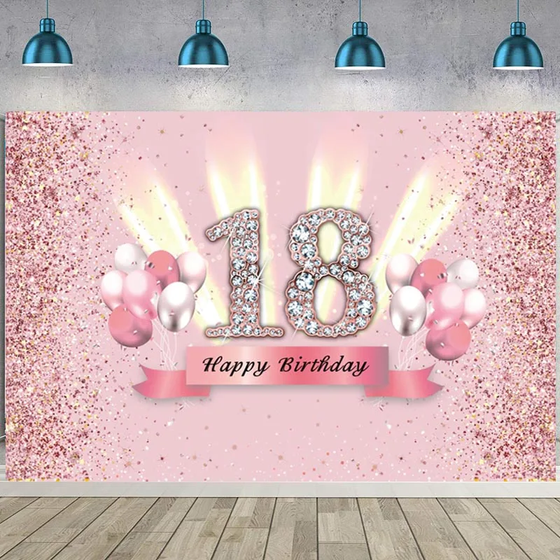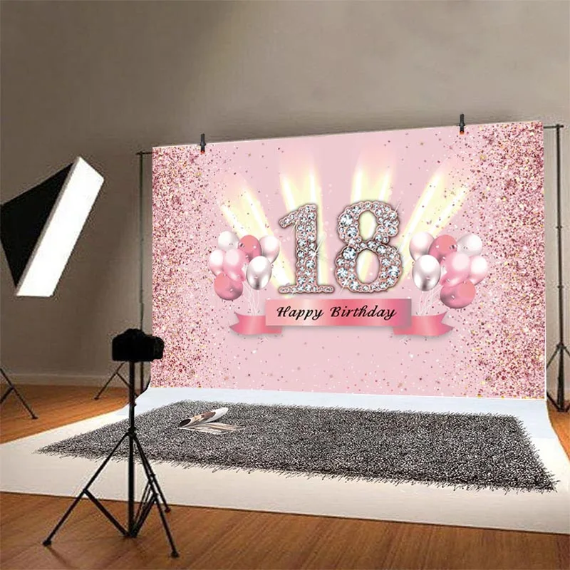 Милый 18-й фон розовый воздушный шар блестящие бриллианты для девочек вечеринка в честь Дня Рождения индивидуальный фон для фотографий торт стол Декор баннер