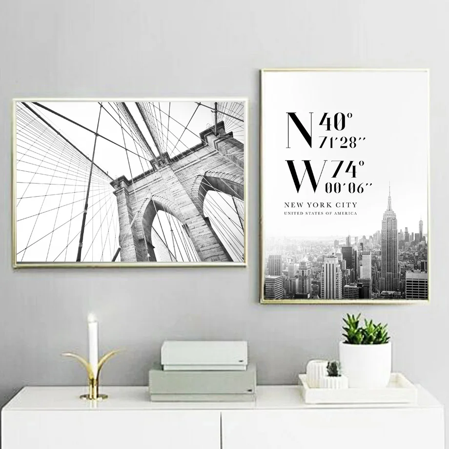 Плакаты и принты в скандинавском стиле с изображением моста Нью-Йорка, черные и белые картины на холсте для домашнего декора гостиной