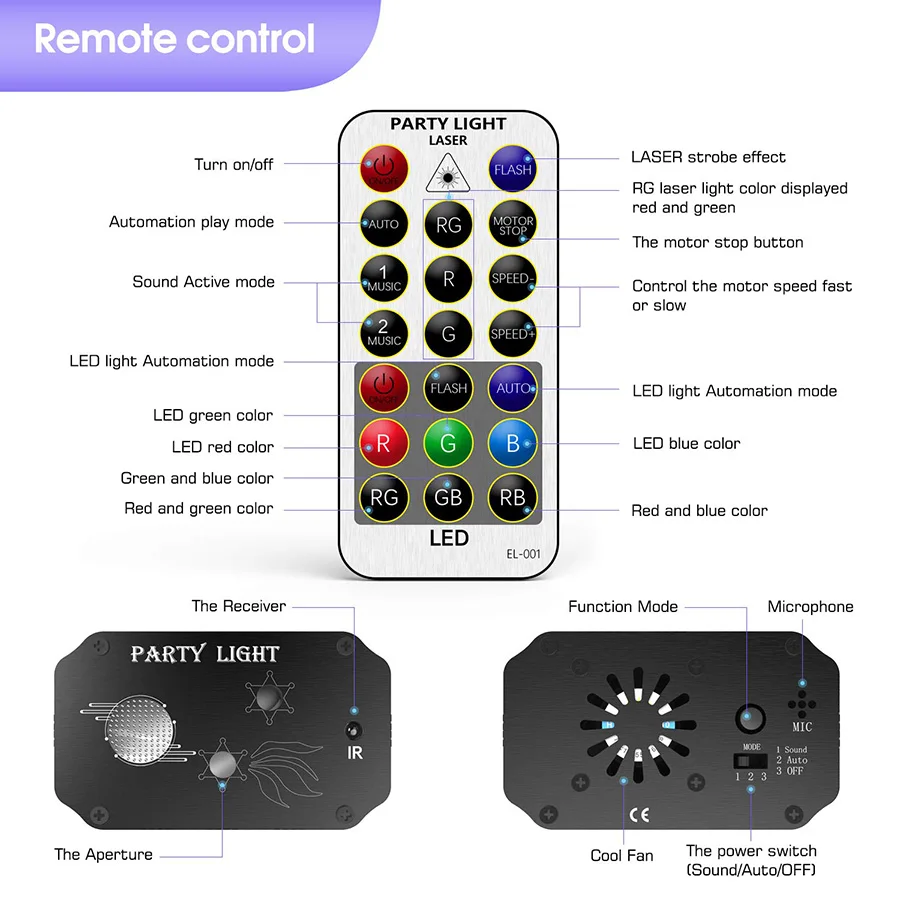【Пульт дистанционного управления 】 пульт дистанционного управления может регулировать включение/выключение, скорость двигателя, цвета и цвета фона, переключать 3 режима работы (Авто/Звук/Стробоскоп). Авто (изменение цвета автоматически), управление звуком (изменение цвета с музыкой), стробоскоп (цвета появляются и быстро исчезают).
