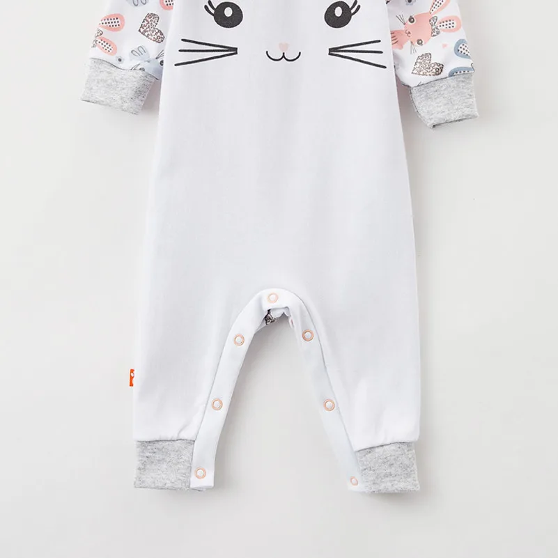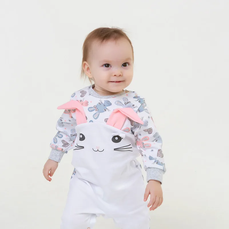 Трикотажный комбинезон с длинными рукавами из коллекции "Funny Bunny". Защитит принцессу от переохлаждения. Главные особенности модели – набивка с изображением милой мордочки и ушки с красивым бантиком. Плоские кнопки, расположенные на плечах и в паховой зоне комбинезона, позволят с легкостью переодеть малышку. Модель будет идеально сочетаться с рукавичками или пинетками из одноимённой коллекции.
