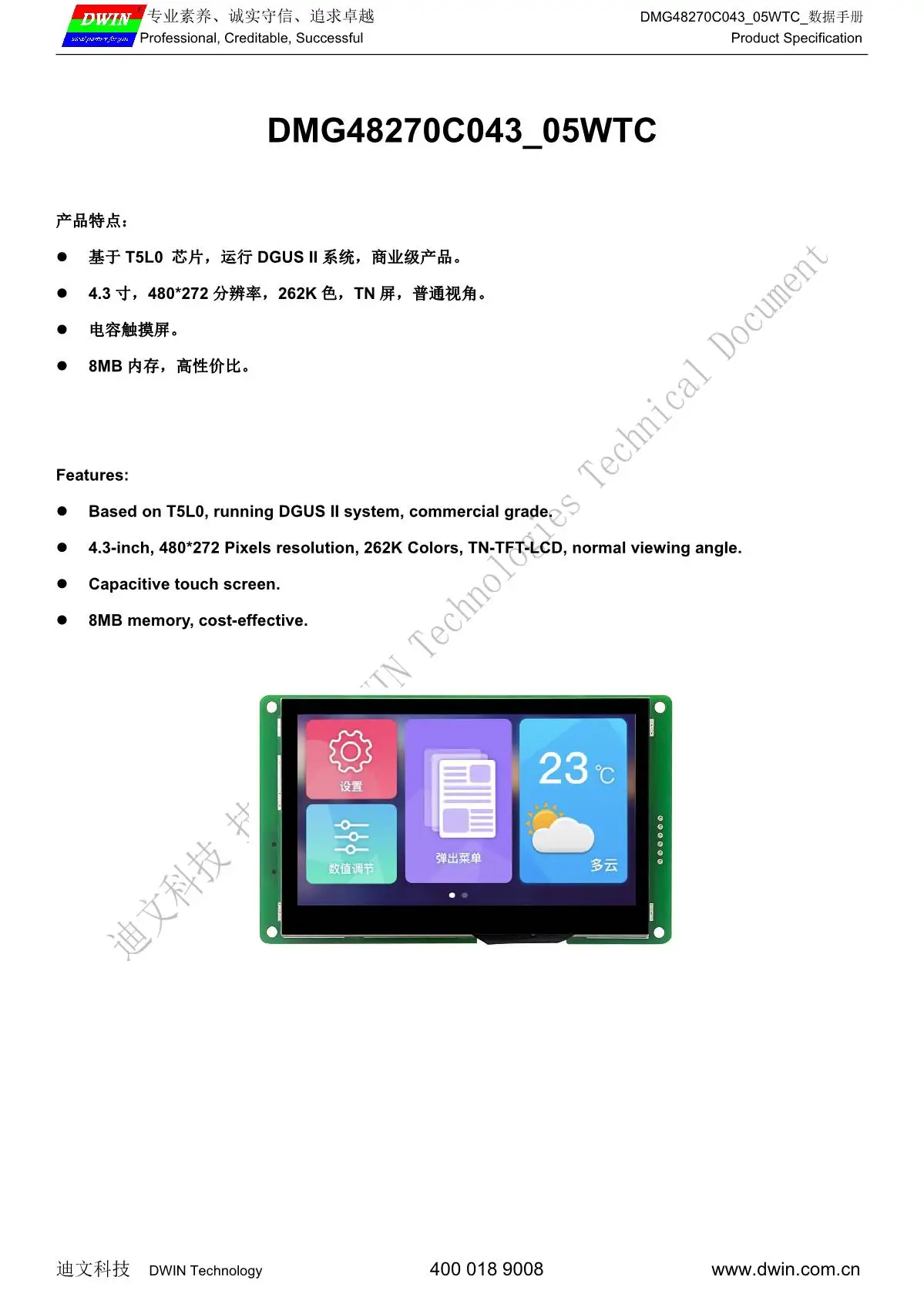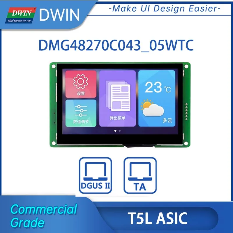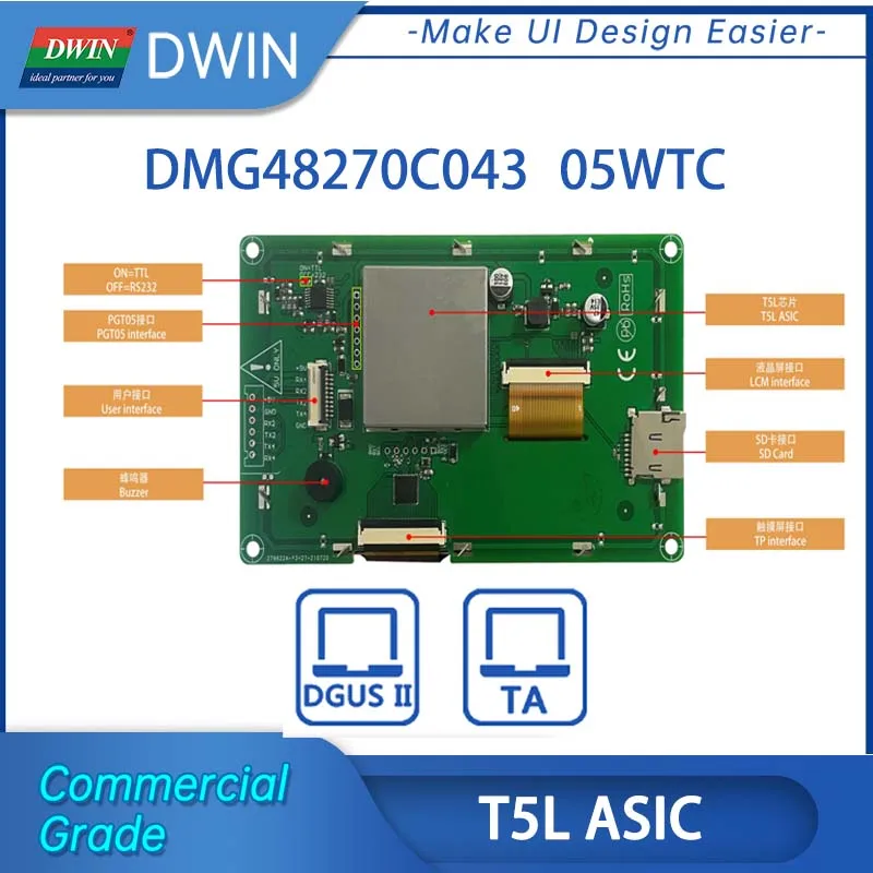 DWIN 4,3 дюймов 480x27 0 Разрешение, 262 к цветной сенсорный экран, нормальный угол обзора, коммерческая мойка высокого стандарта на тонкопленочных транзисторах на тонкоплёночных транзисторах ЖК-дисплей модуль Дисплей HMI резистивный экран панель. Это интеллектуальный сенсорный экран с портом UART, который может управляться любым MCU с помощью команды, поэтому его можно использовать в качестве TFT дисплея и сенсорного контроллера в различном электронном оборудовании. Панель ЖК-дисплея, сенсорный ЖК-экран, дисплей DWIN-ваш лучший выбор для проекта HMI. ЖК-дисплей DWIN на базе процессора DWIN T5L с двухъядерным процессором GUI и OS. Ядро GUI может поддерживать дизайн интерфейса на основе мощного программного обеспечения DWIN design, включая данные, текст, кривые, базовую графику, загрузку ключа, И т. Д. Ядро ОС можно открыть клиенту для второй разработки в сборке ОС, и это улучшает функциональность графического интерфейса. Все MCUs могут подключаться к интеллектуальному дисплею DWIN.