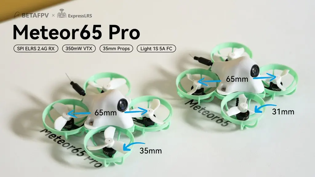 Meteor65 Pro поставляется с пропеллером 35 мм для улучшения мощности и гибкого летательного эксперимента. Кроме того, он имеет почти те же компоненты, что и Meteor65, как F4 1S 5A плата FC со встроенным приемником ExpressLRS, до 350mW M03 VTX, 19500KV 0802SE двигатели и т. Д.