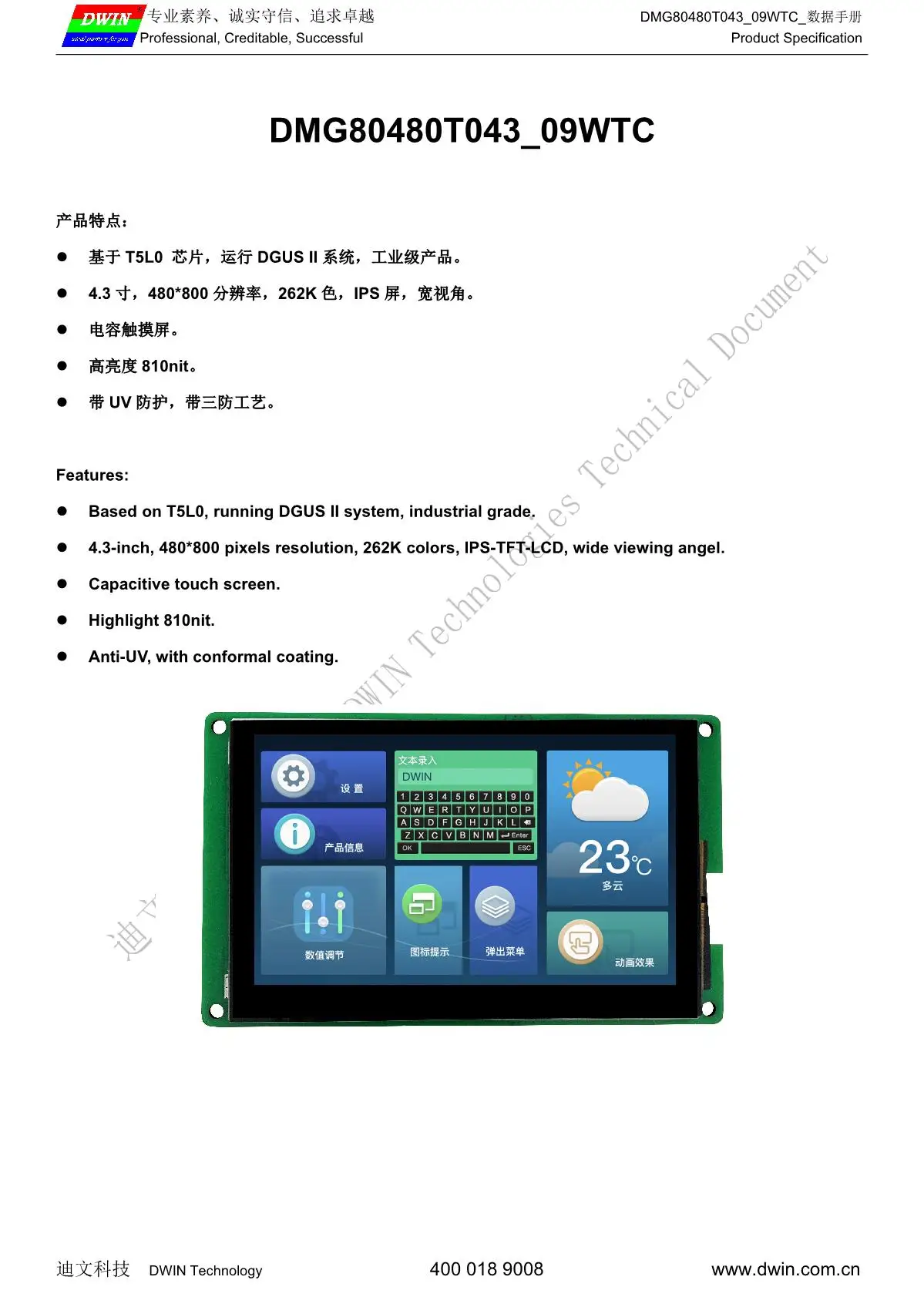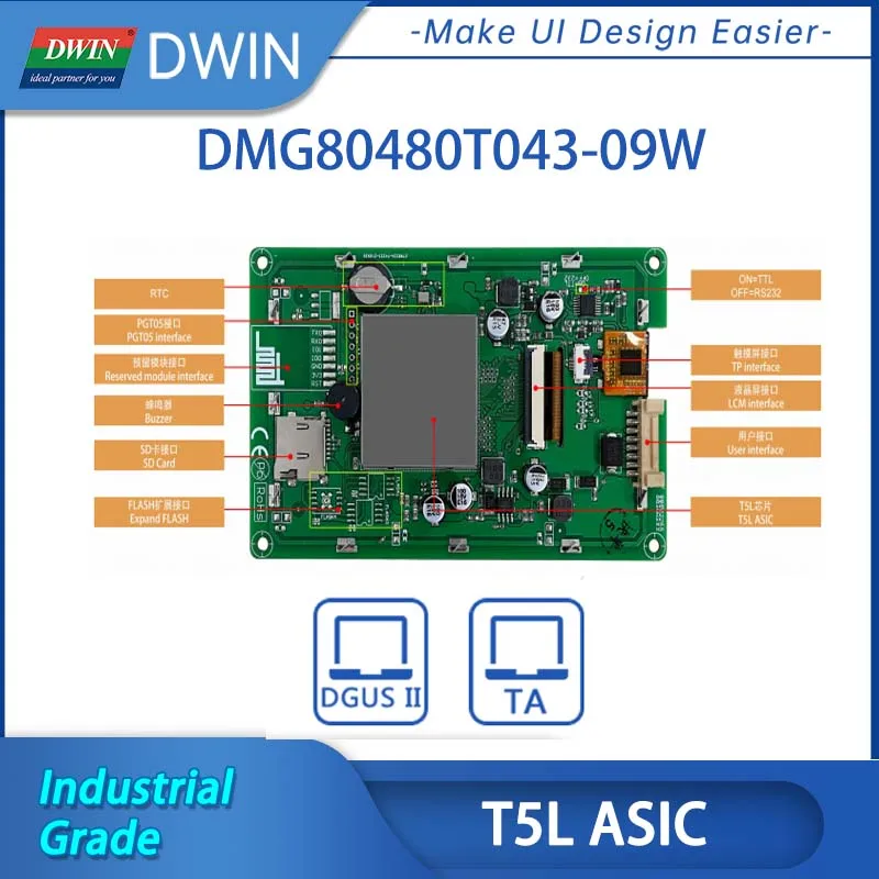 DWIN 4,3 дюймов 800*480 Разрешение, 262 к цветной сенсорный экран, IPS, Промышленный высокий стандарт на тонкопленочных транзисторах на тонкоплёночных транзисторах ЖК-дисплей модуль Дисплей HMI резистивный экран панель. Это интеллектуальный сенсорный экран с портом UART, который может управляться любым MCU с помощью команды, поэтому его можно использовать в качестве TFT дисплея и сенсорного контроллера в различном электронном оборудовании. Панель ЖК-дисплея, сенсорный ЖК-экран, дисплей DWIN-ваш лучший выбор для проекта HMI. ЖК-дисплей DWIN на базе процессора DWIN T5L с двухъядерным процессором GUI и OS. Ядро GUI может поддерживать дизайн интерфейса на основе мощного программного обеспечения DWIN design, включая данные, текст, кривые, базовую графику, загрузку ключа, И т. Д. Ядро ОС можно открыть клиенту для второй разработки в сборке ОС, и это улучшает функциональность графического интерфейса. Все MCUs могут подключаться к интеллектуальному дисплею DWIN.