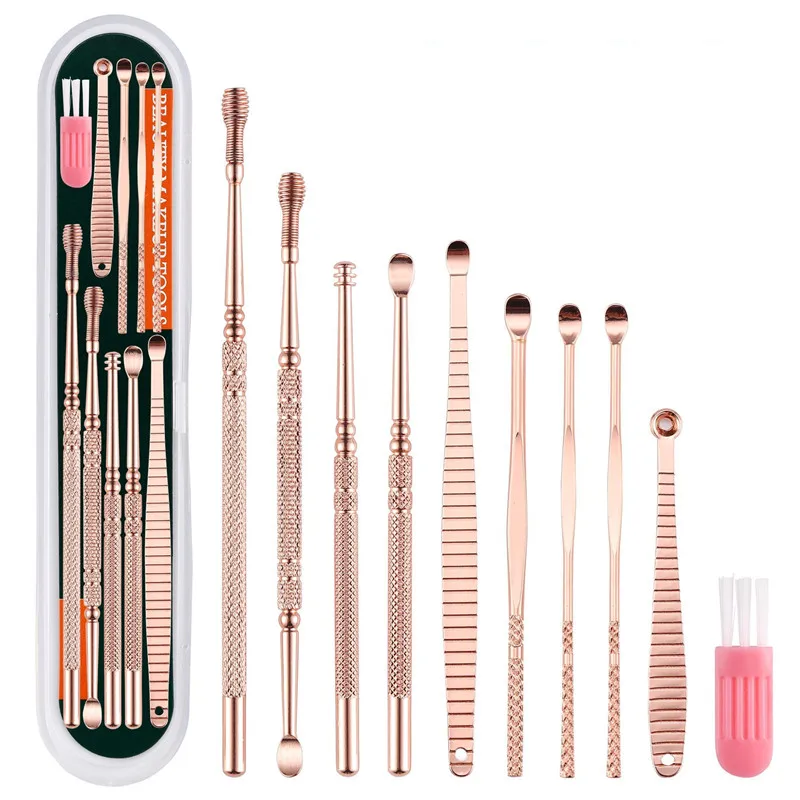 Нержавеющая сталь, розовое золото, 10 шт., инструмент для удаления вощеных ушей, 360 °, без мертвых углов, многофункциональный набор для чистки ушей