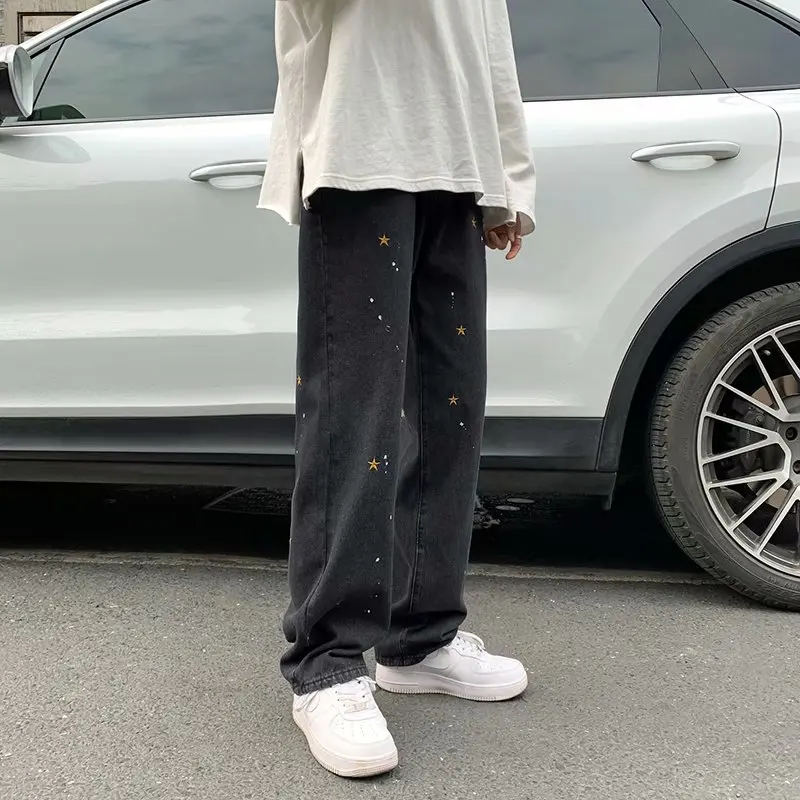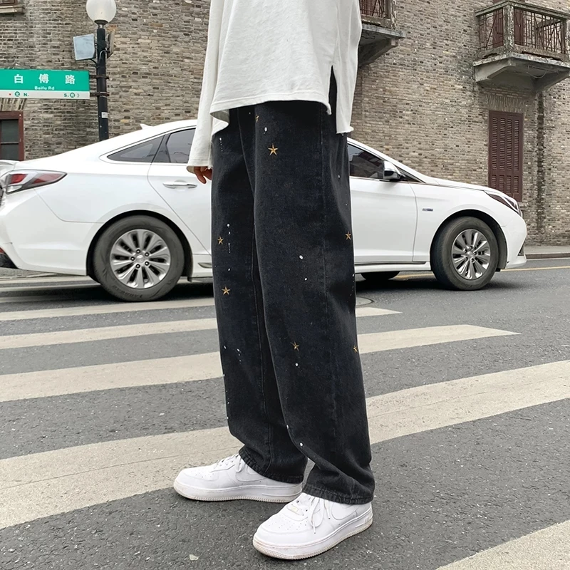Черные джинсы с вышивкой звезд, мужские Модные брендовые прямые джинсы, свободные уличные брюки в стиле хип-хоп, жареные брюки большого размера с широкими штанинами, новинка 2021
