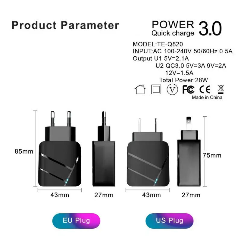 Зарядное устройство для телефона с двумя портами QC3.0 + 2.1A, 28 Вт, штепсельная вилка Европейскогоамериканского стандарта, тройная настенная зарядная головка