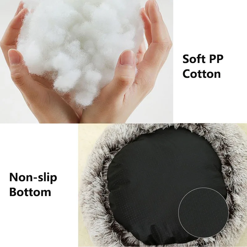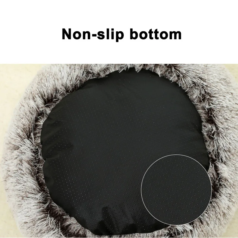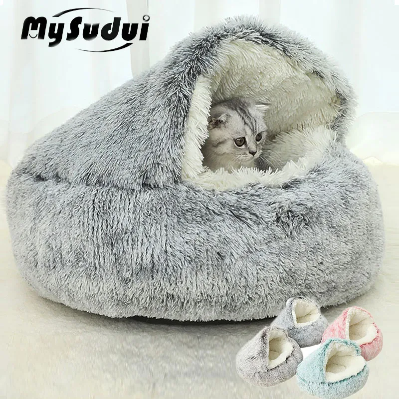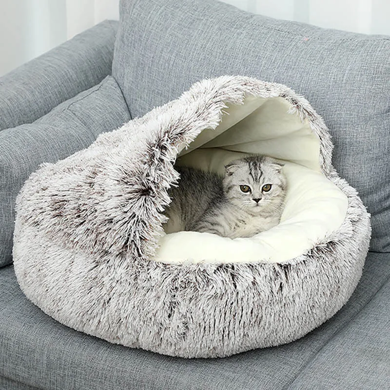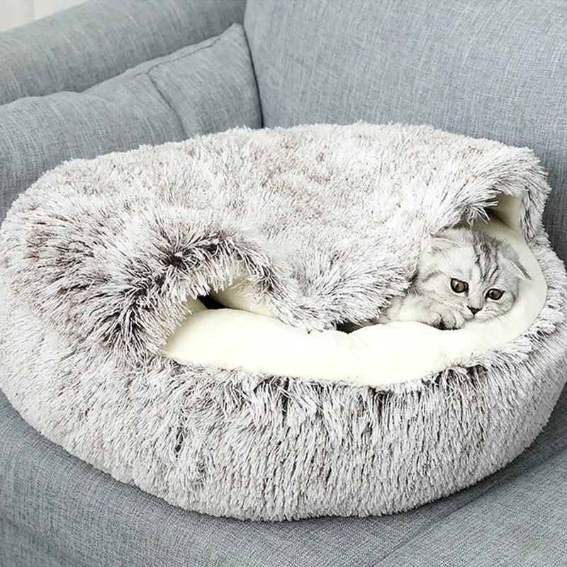 Круглая кровать для кошки, мягкая длинная плюшевая кровать для собаки, зимняя корзина для щенка, подушка, теплая пушистая кровать для коврика для кошек, домашний диван для сна
