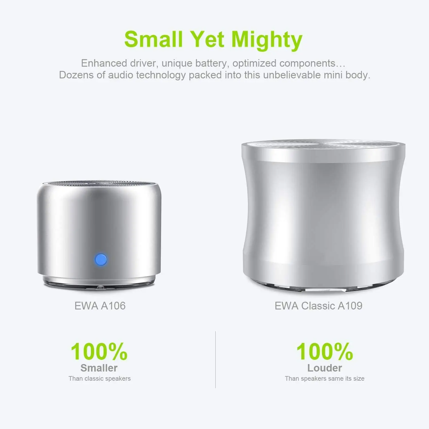 Воспроизводите громкий звук.Благодаря полностью оснащенному неодимовому драйверу высокой производительности 3 Вт на заказ, EWA A106 на удивление громкий с хорошо сбалансированным звуком, даже громче, чем большинство динамиков, которые удваивают его размер.