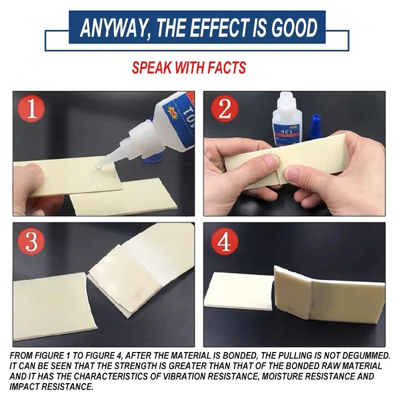 Подходит для быстрого склеивания большинства металлов, пластмасс или эластомеров, особенно для склеивания пористых, кислотных и абсорбирующих материалов. Например: дерево, бумага, кожа или ткань. При использовании в сочетании с средством для обработки поверхности, он также подходит для склеивания труднодоступных материалов, таких как ПВХ, нейлон, ПП и ПЭ.