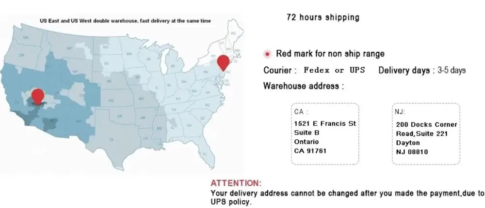 El almacén de EE. UU./AU se Envia en 1 Dia laboral.Almacén de EE. UU. : California y Nueva JerseyAlmacén Австралия: Sidney, NSW AU