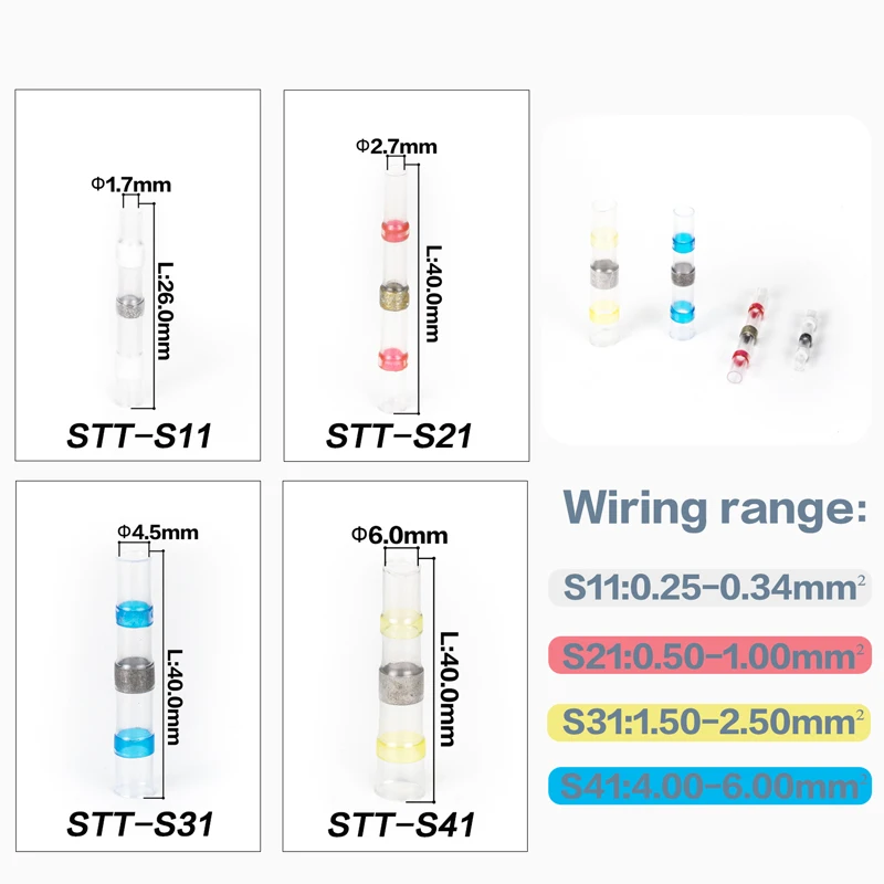 Термоусадочные соединители для провода------ Предоставить вам квалифицированные терминалы и удовлетворить ваши потребности в различных проектов электропроводкиНезависимо от того, работаете ли вы на своей лодке, транспортном средстве, домашнем или Научном объекте, наши термоусадочные паяльные и уплотнительные соединители обеспечат плотную пайку, повышенный ток и всепогодные соединения каждый раз ~Особенности:● Коэффициент усадки 2:1● Легкие одношаговые Проводные соединения.● Простая Идентификация: цветная соединительная трубка.● Полиолефиновые термоусадочные стыковые разъемы улучшают прочность на изгиб.● Высококачественные провода разъемы в уплотнение, сброс напряжения, проверка кабеля и изоляция.● Плавленный припой обеспечивает прочное соединение проводов и позволяет избежать выскальзывания проводов из терминала.● Соблюдайте все соответствующие стандарты: ROHS, ISO 9001:2008, SGS и CE.