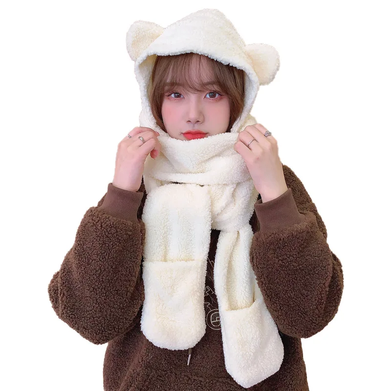 Шапка-бини из хлопка и шерсти, милый мягкий однотонный шарф, перчатки, шапка для зимы, женская шапка с медведем для девочек, теплая шапка с защитой рук и шеи и ушей