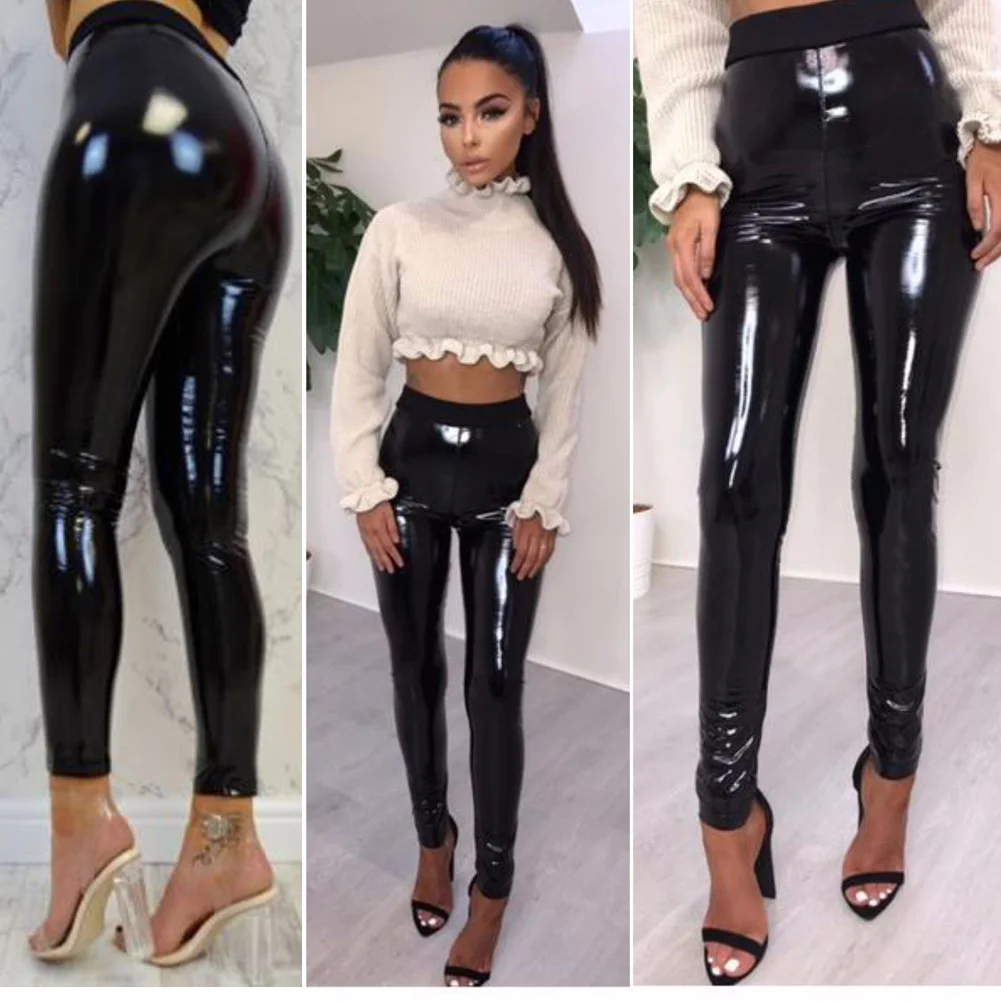 Женские брюки из искусственной кожи, облегающие блестящие леггинсы с высокой талией, эластичные длинные брюки-карандаш