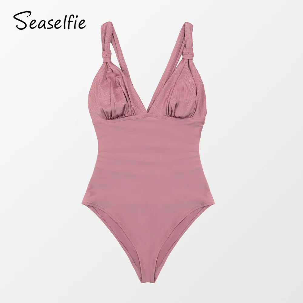 SEASELFIE слитный купальник в рубчик с V-образным вырезом для женщин, сексуальный Монокини с открытой спиной, купальник 2022, новый пляжный купальный костюм, пляжная одежда