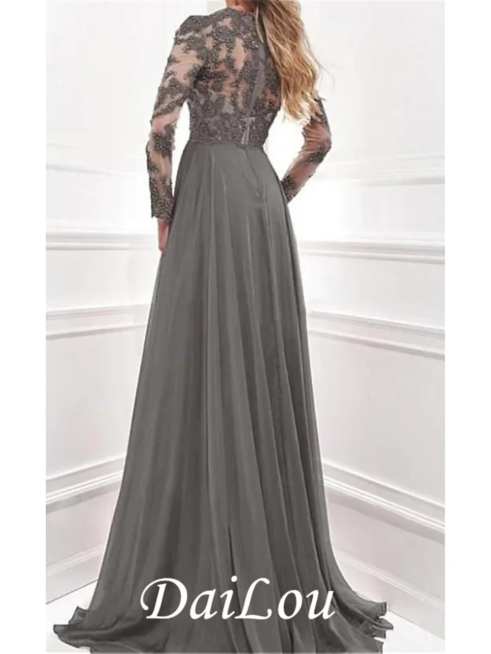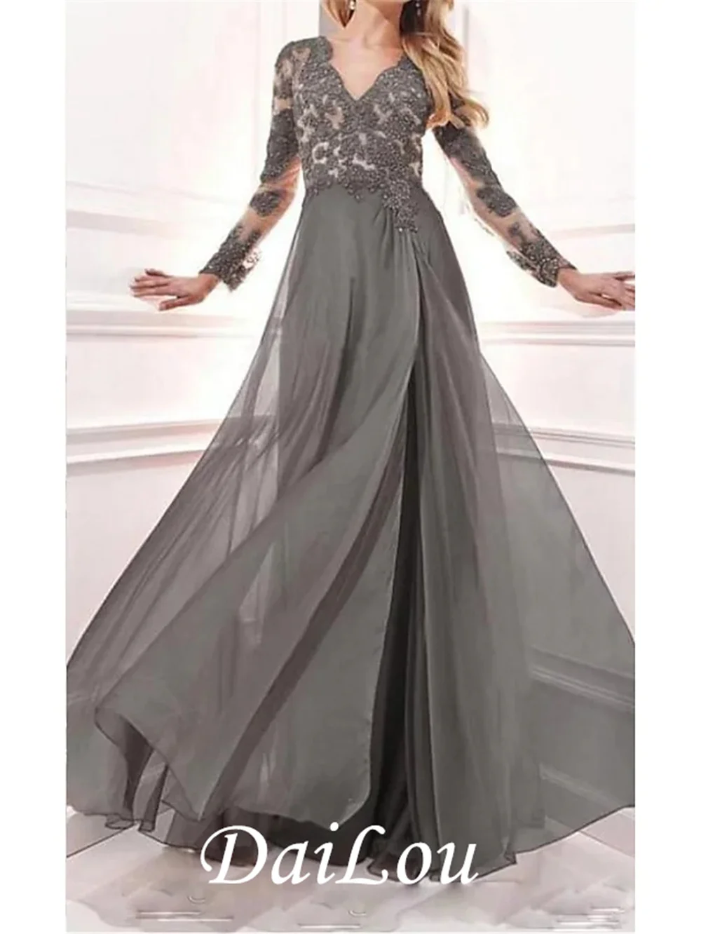 Шифоновое платье для матери невесты, ТРАПЕЦИЕВИДНОЕ кружевное платье с V-образным вырезом, длинным рукавом и разрезом спереди, с принтом, 2021