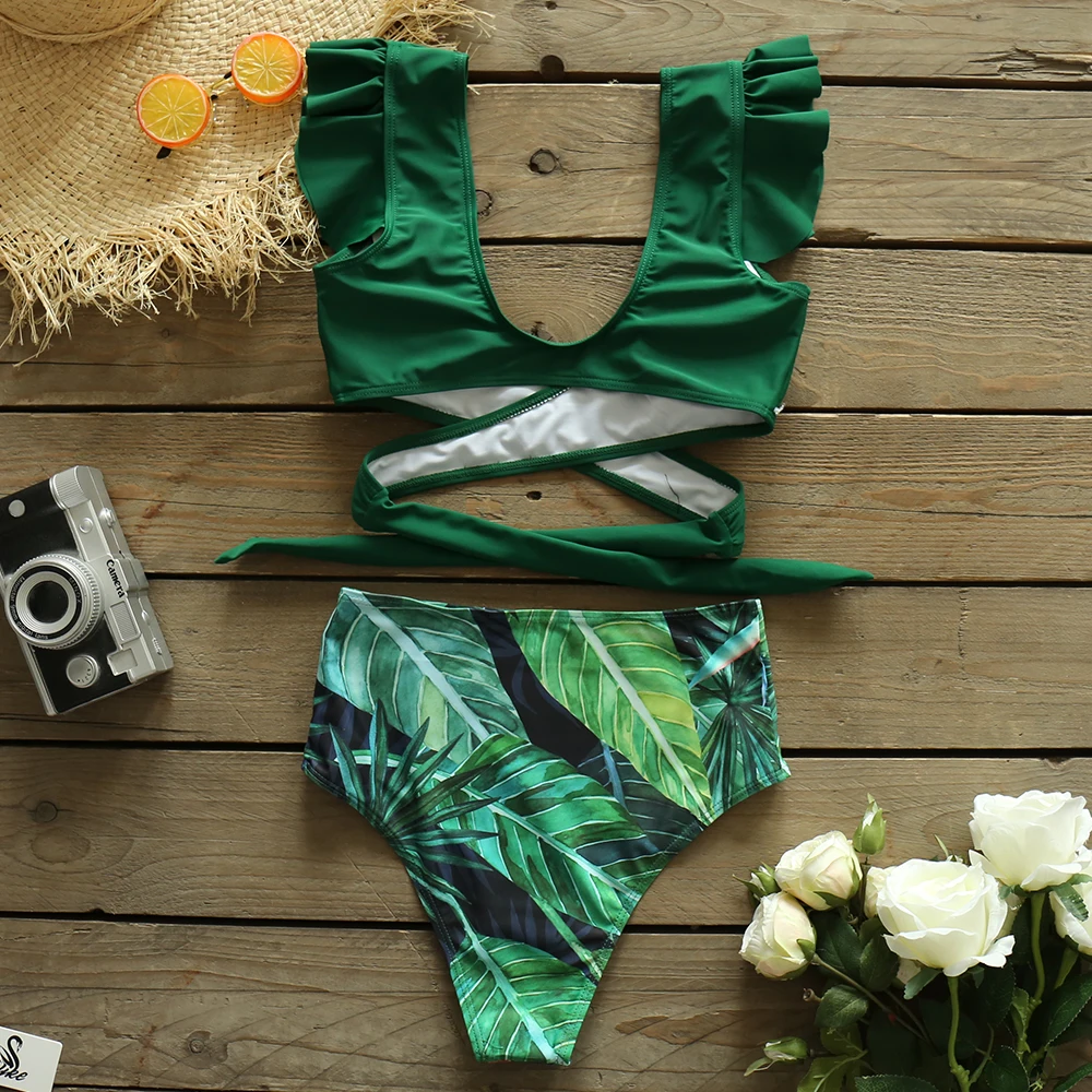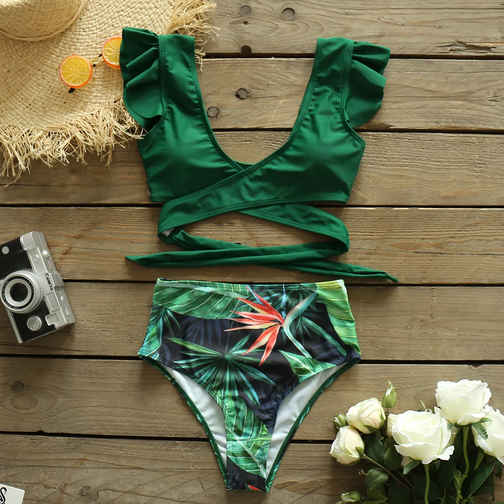 Купальник-бикини женский с завышенной талией, чашками пуш-ап и воланом