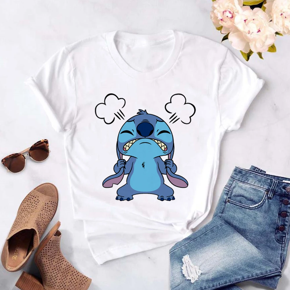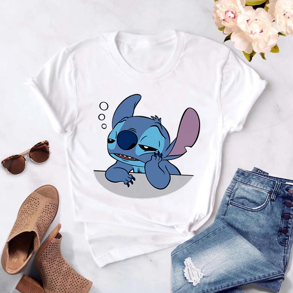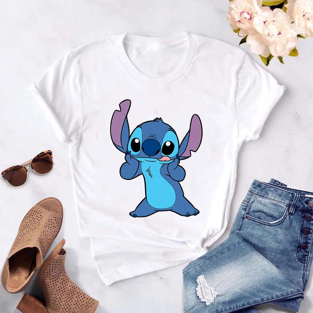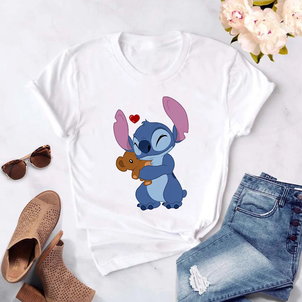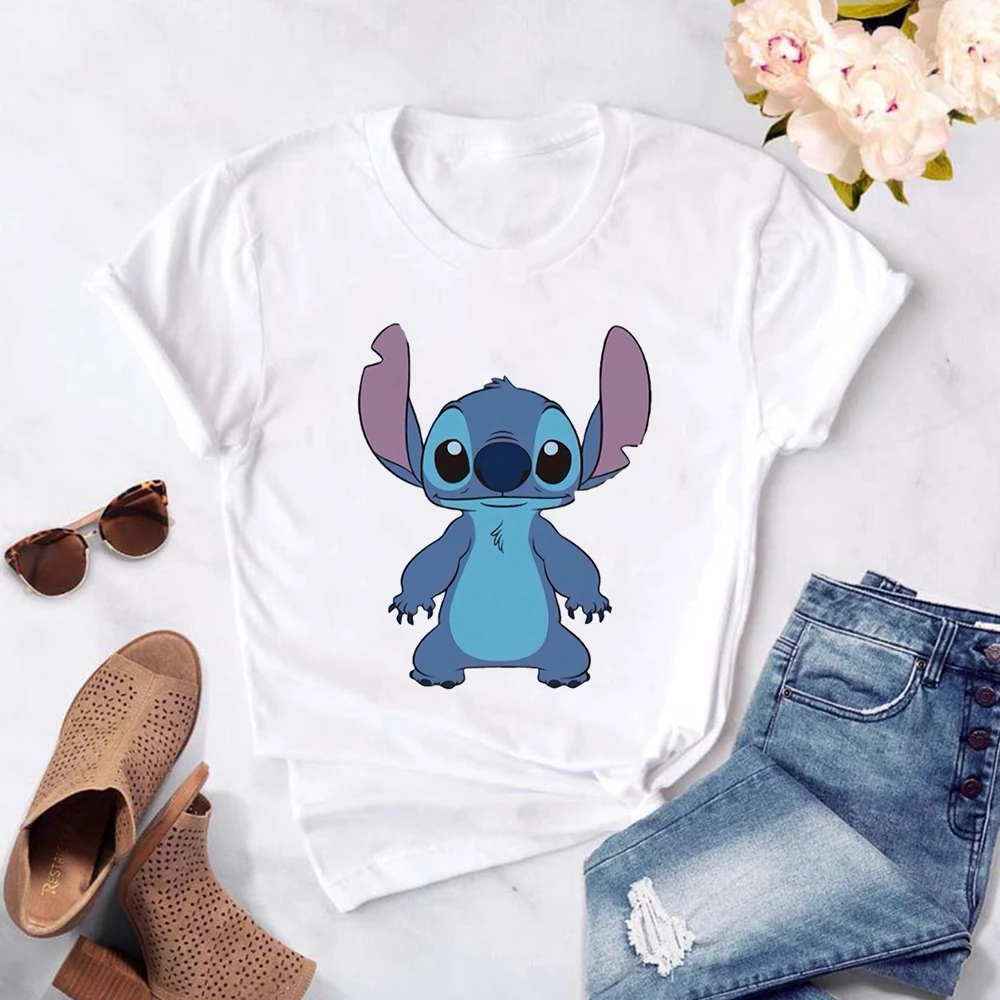 Футболка Lilo Stitch с мультяшным рисунком, женский топ, корейская модная летняя женская футболка, белая повседневная футболка с круглым вырезом и вышивкой