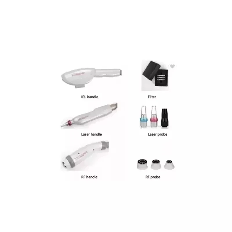 Упаковочный лист: 1. Лазерная ручка X 1 2. Ручка E-Светильник X 1 3. Ручка RF 4. Фильтр X 5 , RF head X3 5. IPL и лазерные защитные очки X 4 6. Ножной переключатель X 1 7. Руководство/инструкции на английском языке 8. Воронка x1