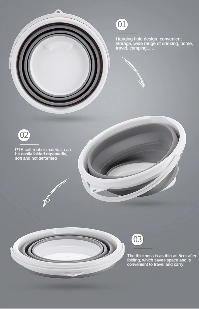 1. Очень подходит для кемпинга, использования в помещении или на открытом воздухе и очень прост в хранении. В верхней части каждой большое ведро 33,2 см в длину, длина по стельке 20,5 см в длину, при росте 23,7 см. Можно сложить в высотой всего 5 см в тех случаях, когда они не используются. Может держать 10 литров воды. Вы также можете выбрать ведра среднего размера для пикников, рыбалки, мытья автомобилей и т. Д. 3. Складное и складное Силиконовое ведро, складной светильник, вес, легко носить с собой 4. Подходит для кемпинга, рыбалки, поездок на автомобиле, пеших прогулок и многих видов активного отдыха.
