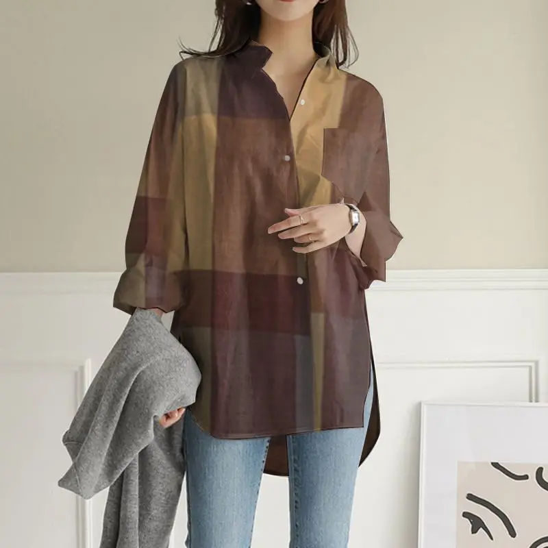 Женская блузка с длинным рукавом, асимметричная, осенняя, в клетку