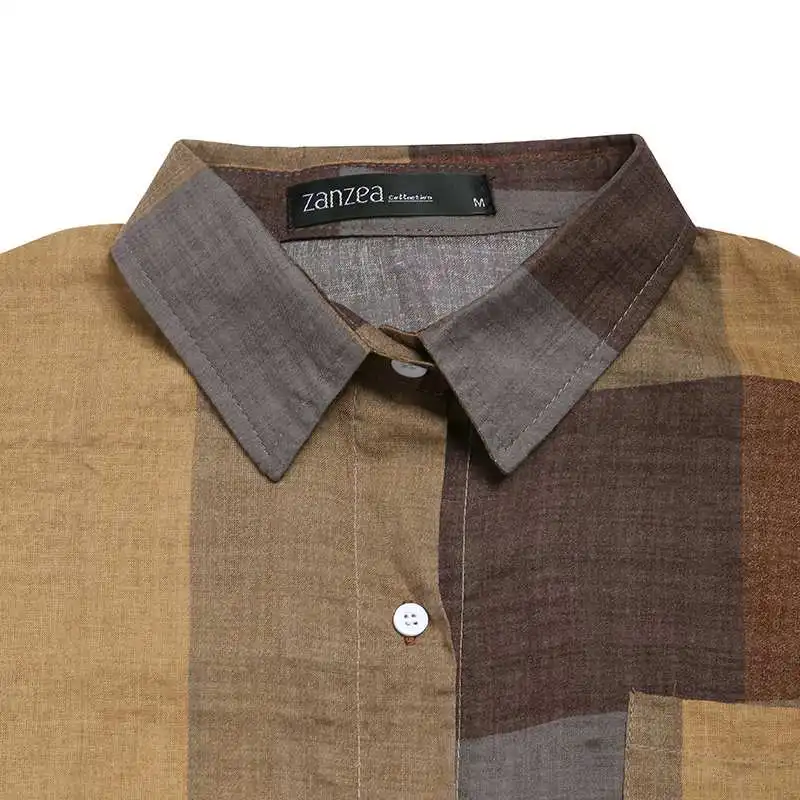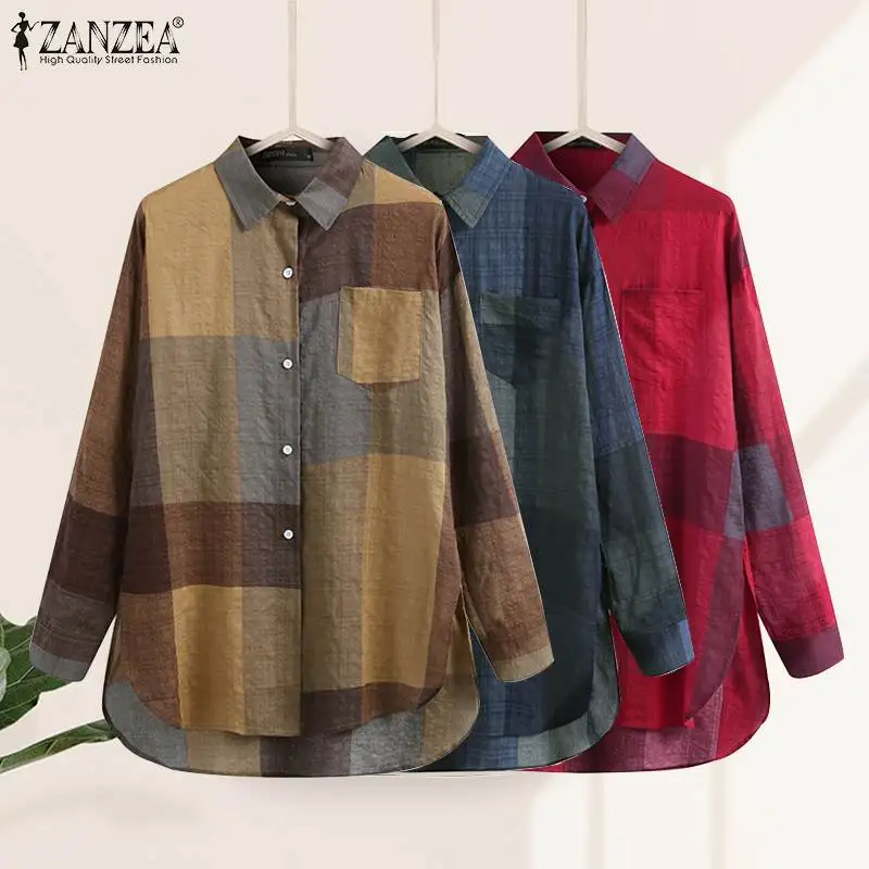 Женская модная Асимметричная блузка, осень 2021, клетчатые рубашки ZANZEA, большие размеры, винтажные Блузы с длинным рукавом, Женская Повседневная рубашка