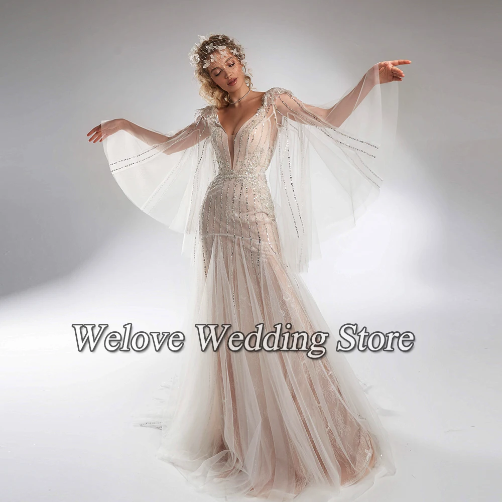 Женское кружевное свадебное платье, изысканное платье цвета шампанского с блестками и рукавами-фонариками, модель 2021 большого размера