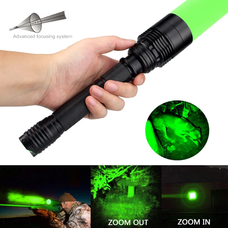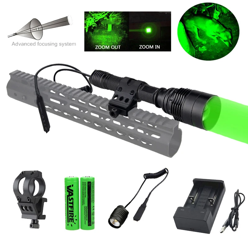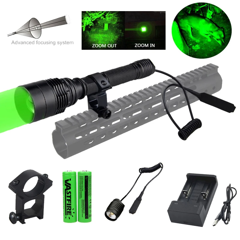 Водонепроницаемый зеленый охотничий фонарик с регулируемым фокусом фонарь дистанционный переключатель давления + крепление для прицела + 2 аккумулятора + зарядное устройство
