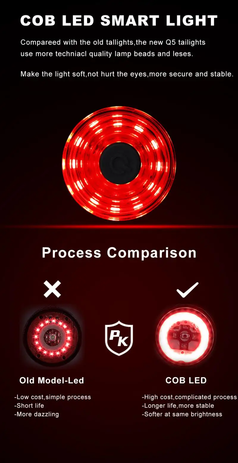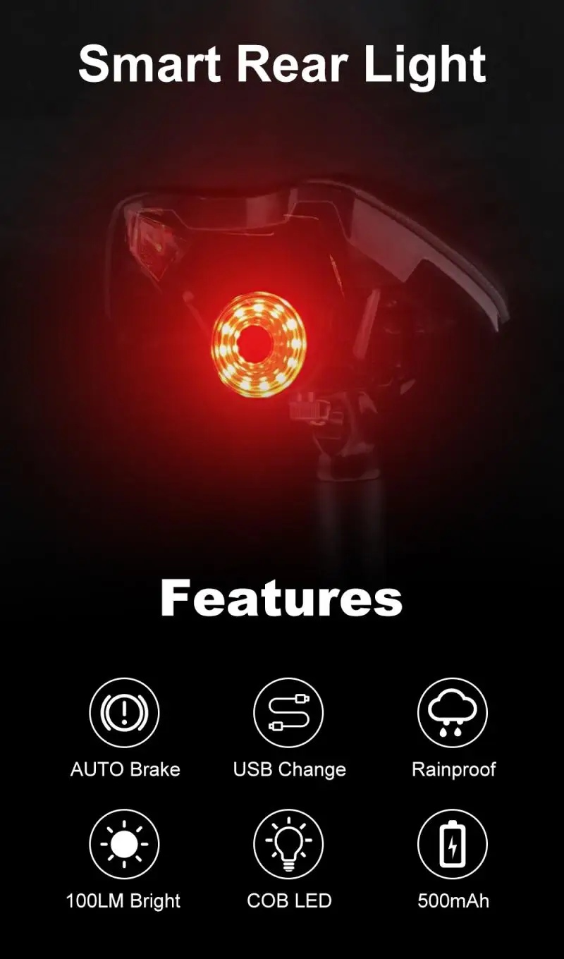 2. Интеллектуальный Индукционный тормоз: когда тормоз обнаружен, автомобильные огни будут подсвечиваться в течение 5 секунд, введите медленное мигание, подождите 10 секунд и автоматически выключите без потери мощности