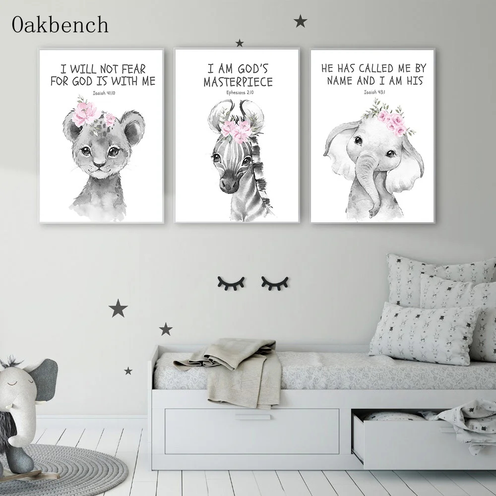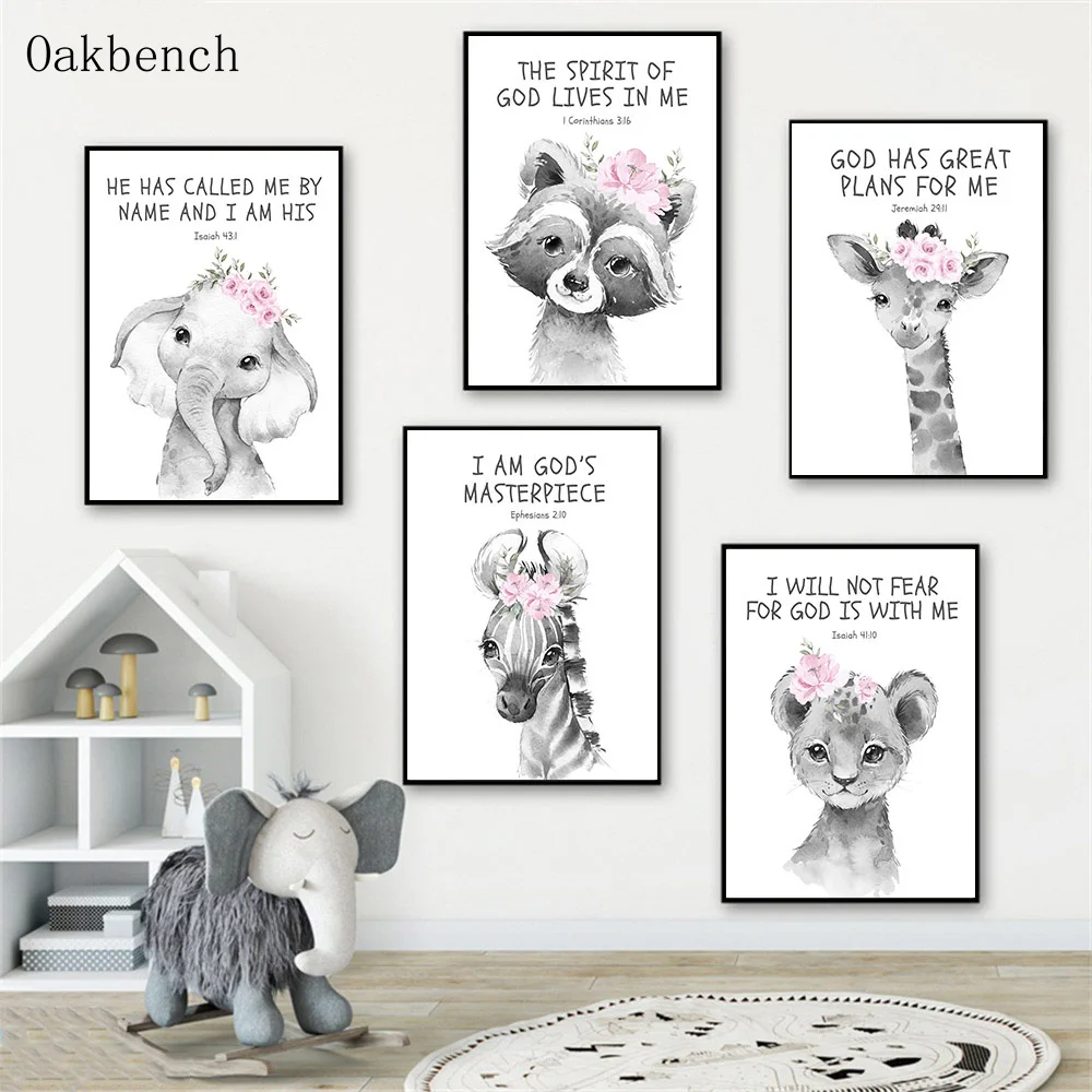 Картина на холсте со слоном, жирафом, зеброй, медведем, цветком, детской комнаты