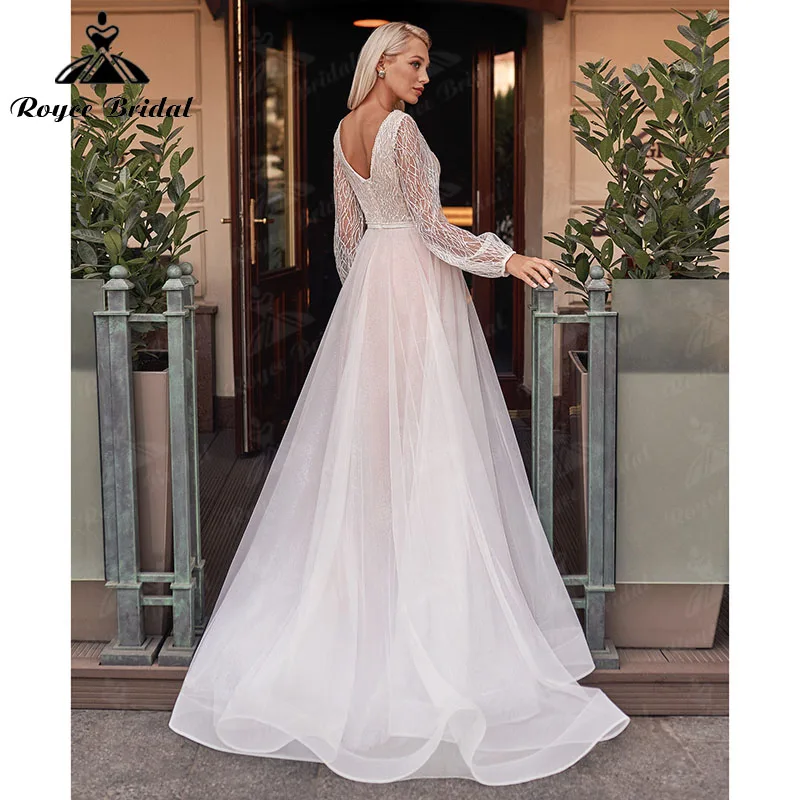 Женское блестящее свадебное платье, элегантное пляжное платье с V-образным вырезом, открытой спиной и длинными пышными рукавами в стиле бохо, официальное свадебное платье Roycebridal