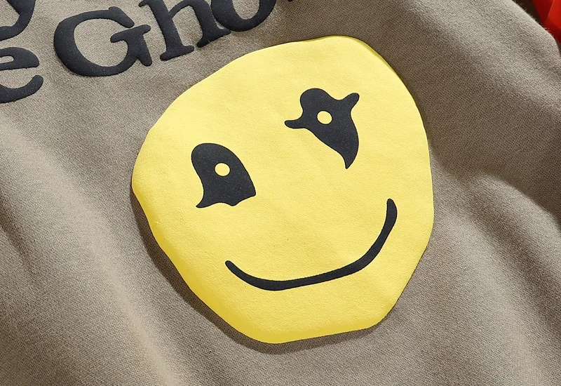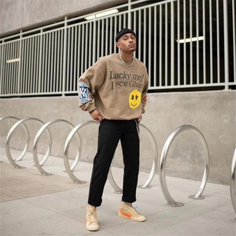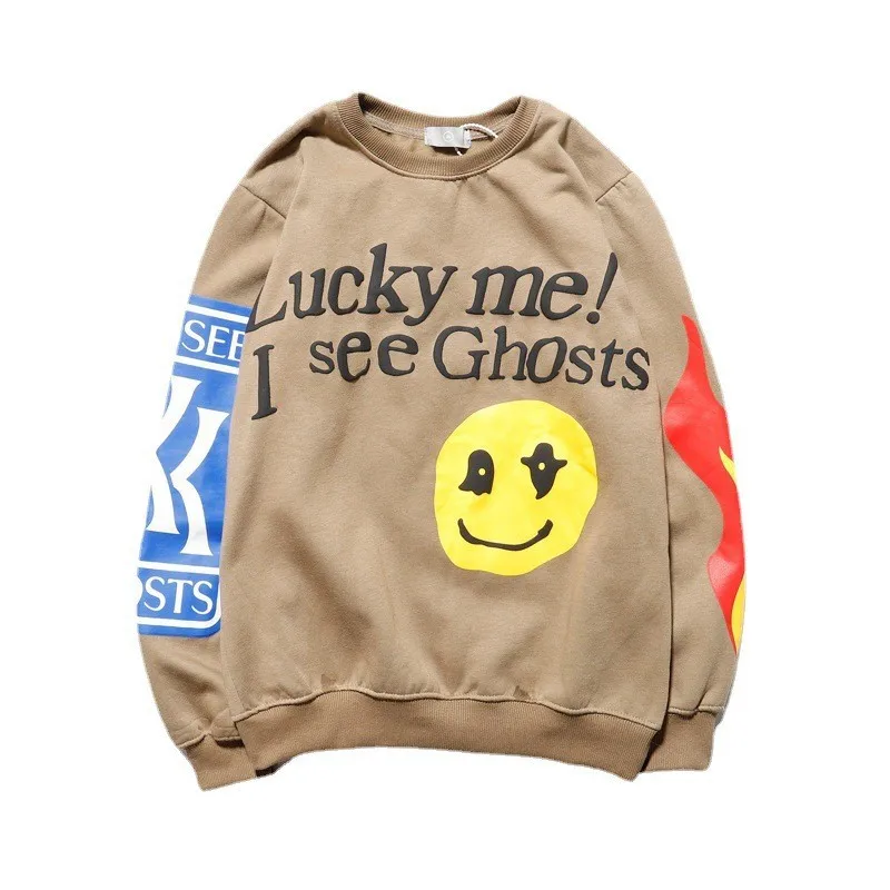 Толстовка Kanye West с надписью Lucky Me I See Ghost, Свитшот со смайликом и принтом пламени, пуловер с круглым вырезом для мужчин и женщин, флисовая уличная одежда большого размера