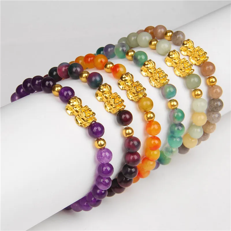 Браслеты фэн-шуй Pixiu для женщин и мужчин, многоцветные полосатые Агаты, бусины из нефрита, очаровательный браслет, богатство, удачи, унисекс-браслет