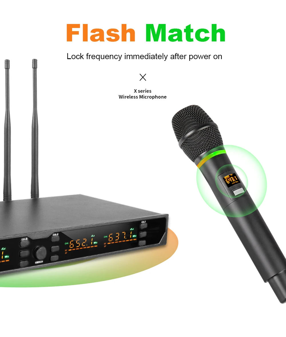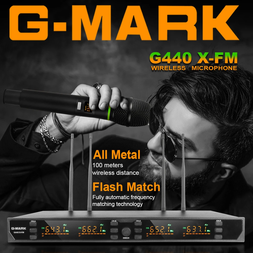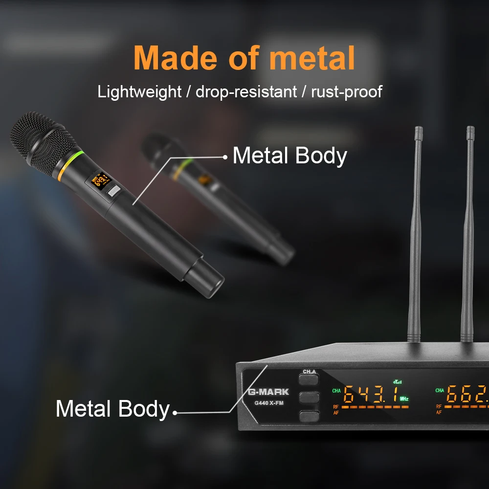 G440XFM-это беспроводной микрофон, специально разработанный для больших речевых, вечерние и уличных поющих приложений. Его дизайн красивый, простой в использовании, металлический ручной микрофон, прочный и долговечный. Кроме того, уникальный неоновый дизайн halo особенно подходит для использования в темных условиях и имеет функцию соответствия молнии, которая подключается при включении. Микрофон оснащен кнопками, меняющими частоту молнии, которые могут менять частоту одной кнопкой, избавляться от помех и адаптироваться к использованию нескольких беспроводных устройств (с блокировкой ID, приемник не будет соответствовать другим микрофонам с той же частотой); В то же время, G440XFM имеет свободную дистанцию приема 80-100 метров, и пользователи могут перемещаться в парках, классах и других местах и избавляться от ограничений микрофонного кабеля.